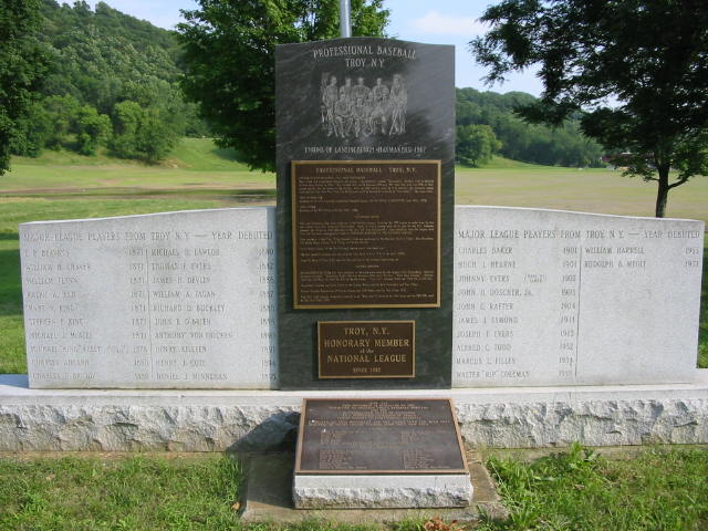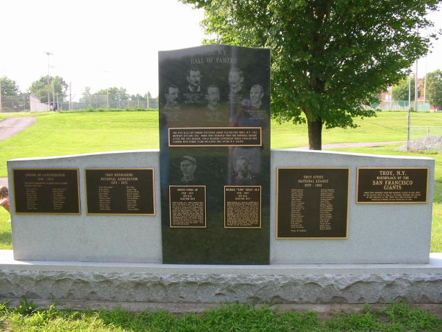 | This monument celebrates the history of professional baseball in Troy, which was a member of the National League in the late 1800's. In addition, the monument lists all the players from Troy who have played in the Majors, and includes renderings of several hall of famers from this city, just outside of Albany. The monument is located in Knickerbacker Park, which is the site where the Troy Haymakers played. |