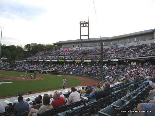 | Blair County Ballpark is a new double-A park that actually doesn't follow the usual template of most new facilities built since the early 90's. While the park is unique in this sense, I don't like it as much as many of the other new parks. The park does have an interesting location as an amusement park is adjacent to the ballpark. This allows for a roller coaster to provide the back drop in right field. And if you are there on a night when the park is open, you'll see the roller coaster with "Go Curve" spelled out on the side. Fans enter the park on the upper concourse which runs behind the seating areas, out of view of the field. This upper concourse allows access to the upper deck seating, where the majority of the seats are located. The lower concourse runs underneath the upper deck and is in view of the field. It features numerous concessions stands offering sausages, pizza, buffalo chicken tenders, bbq sandwiches, and cinnamon roasted nuts as well as the standard ballpark fare. There is a large BBQ stand along the first base line, but strangely they only server burgers there. Prices are average for the minor league level while quality is a little above average. While the seating is very comfortable due to the spaciousness of the seats, it is a bit far from the field for such a new park, especially that in the upper deck. Over recent years bleachers have been added in left field along with some bar-type seating. There is also a large picnic area located down the 3rd base line. One aspect I don't like about BCB is all the picnic tables located along the lower concourse. This makes that area feel much more cramped than it needs to. When you have a large picnic area already, I'm not sure why you need to flood the concourse with tables as well. Along the first base concourse are games for the kids like what you'd find at an amusement park, which are actually kinda neat. A small gift store is located off of the upper concourse. Parking is $2 in the garage behind the outfield wall. Overall, Blair County Ballpark is a very pleasant place to see a game. And it's obvious that folks in Altoona think the same, as they continue to fill the ballpark year after year.