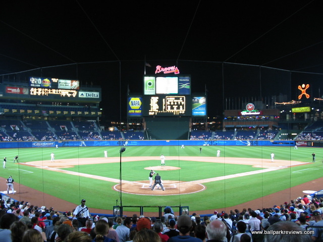 of a ballpark. One nice touch is the dual concourses - there is one for both the 100 level and 200 level seats. This really helps to ease the stampede of fans that usually occupy the main concourse of a stadium. The atmosphere at Turner Field can be a bit minor league at times - silly contests are done between many innings and the soundtrack can be annoying. With the outfield open (and Fulton County Stadium now torn