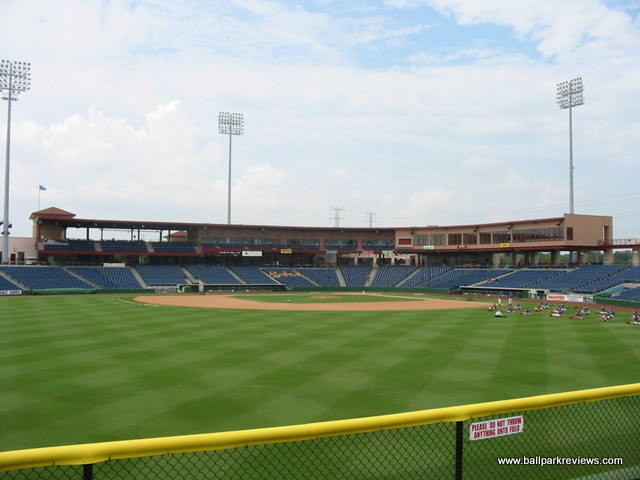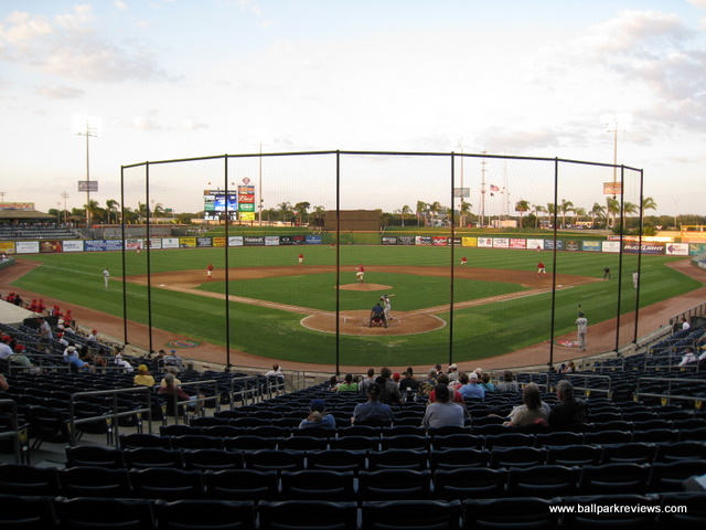 | As with most of the facilities in the Florida State League, Spectrum Field (now known as BayCare Ballpark) was built for spring training, so seems like overkill when the minor league season starts. Having only seen FSL games here, I can only assume that watching a Phillies spring training game is much more enjoyable. The ballpark is located right along busy Route 19, so you can hear the traffic rumbling by throughout the game. This is some difference from Jack Russell Stadium which was tucked away in a quiet residential area. The exterior of the new ballpark is nicely landscaped with a stucco finish and a large wishing well located at the main entrance. The interior is very expansive, which is probably needed with the big crowds in spring training. The design is very similar to what is found at other new minor league parks. There is a full wraparound concourse where the field can be seen from any location on it. All seating is of the green fold down chair variety. With the large capacity, some of the seats are a bit far from the field, but this is only a concern during spring training. There is also a small club level section of seating on the first base side. Grass berms are located behind the left and right field fences, allowing fans to spread out with their blankets. The most unique aspect of Spectrum Field is the tiki bar in the left field corner. I'm sure this must be the most popular spot in the ballpark on most nights. A large gift shop is located off the concourse on the third base side. Concessions, even for FSL games, are well varied and reasonably priced. Chicken sandwiches, burgers, and Philly cheese steaks (of course) are some of the selections on the menu. The atmosphere was a bit different from other parks as there was no on field games, but there was lots of music played and several dances (Macarena, YMCA, etc) were done between innings. I attended on a camp day, so there was tons of screaming kids, but I assume the atmosphere on a regular night is a bit more relaxed. Many have called Bright House Field the best spring training venue in Florida. In terms of its structure and amenities, it certainly ranks high, but the location along a busy road detracts from the overall experience for me. I prefer the parks that are located in more quiet areas. Still, there is little doubting that this ballpark is an improvement over the outdated Jack Russell Stadium where the Phillies trained prior.