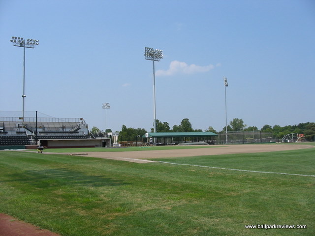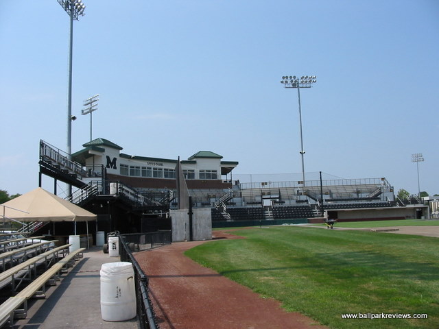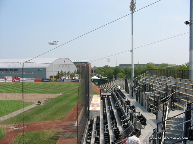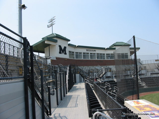 | Taylor Stadium is located on the campus of the University of Missouri. The park was originally built for the Missouri baseball team, which explains all the Tiger logos displayed throughout the park. And the ballpark really feels more like a college park than a minor league park. The seating is steep and set high above the field. The concourse area runs behind the grandstand and is out of view from the field. The Mid-Mo Mavericks played here for three seasons, but did not draw well so decided to sit out the '06 season while trying to get a new ballpark built in Columbia. So it's unlikely that Taylor Stadium will ever see pro baseball again.