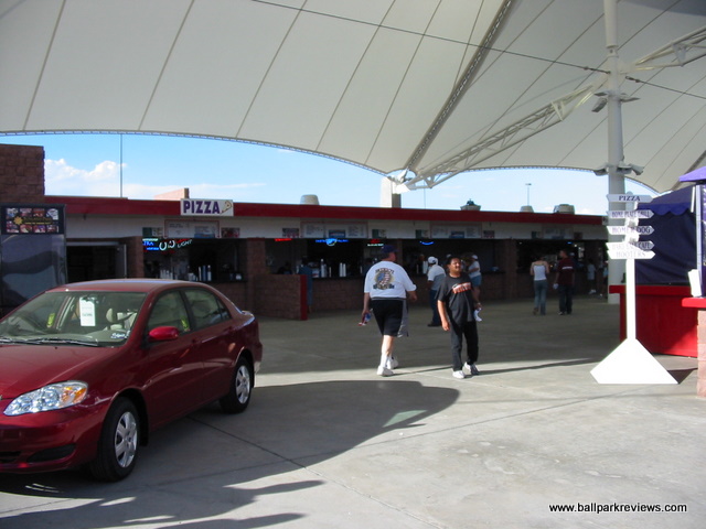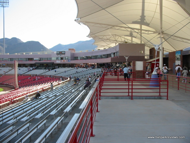 | On a visit to Cohen Stadium, be prepared to be bombarded with sound effects, an annoying PA announcer, and an atmosphere that is more conducive to a circus rather than a baseball game. The ballpark itself is fine, but the whole experience needs to be toned down a bit. It is no wonder they don't draw better - the team certainly has no interest in trying to bring baseball fans to the park. Cohen Stadium is an early version of the now common ballpark template. Fans enter on a wide concourse which overlooks the seating bowl and field. A canopy was added above the third base concourse several years ago as this are was previously uncovered. This is certainly a welcome addition as it can be quite warm in El Paso during the summer months. The seating bowl is very reminiscent of Prince Georges Stadium (Bowie, MD) as it features half fold down chairs and half metal benches. The grandstand is is rather high so some of the seats are a bit far from the field. A picnic area is located in left field and a grassy berm in right field. Cohen Stadium is located north of the city in what should have been a very scenic location. Unfortunately, the park does not face the surrounding mountains. Concessions here are average at best. The usual ballpark fare (burgers, hot dogs, brats, pizza) is offered, but strangely there are no Mexican options. A small team store is located off the concourse behind home plate. Certainly the most memorable part of my visit to Cohen Stadium is the atmosphere. While I thought this experience only existed in the Northeast, unfortunately I was wrong. It all starts with the "cool" PA announcer who was constantly urging the crowds to cheer and make strange noises. For a whole inning he requested that fans howl at the full moon. And if that wasn't enough, there are tons of sounds effects and music played between pitches and at-bats. And of course between innings there was the usual on-field games. All these gimmicks combined with tons of bratty kids running around made for a rather unpleasant night at the park. I prefer to relax when I go to a ballgame, but that is almost impossible to do here. Certainly the El Paso area is big enough to support baseball, but I just wonder if the over-the-top experience at Cohen Stadium has turned some people off. Apparently it did as attendance dwindled to a point where the Diablos were sold and moved to Springfield (MO) after the 2004 season. Fortunately, the Central League quickly moved in and put a franchise here. The bottom line is that if you are a fan of baseball, Cohen Stadium is probably not the ideal place to see a game. With the arrival of the AAA Chihuahuas in 2014 and a new downtown ballpark, the Diablos are no longer. It is unclear what the future holds for Cohen Stadium, but pro baseball is very unlikely.