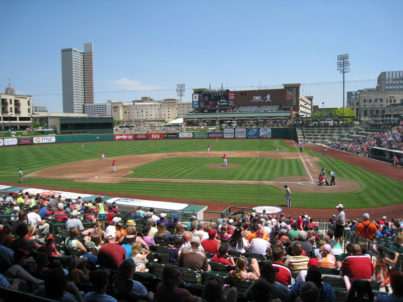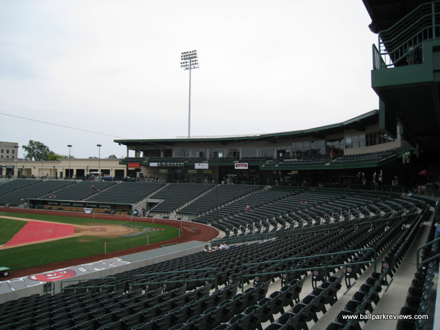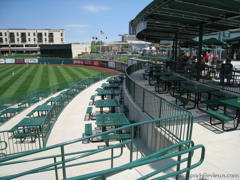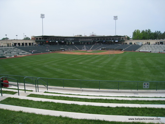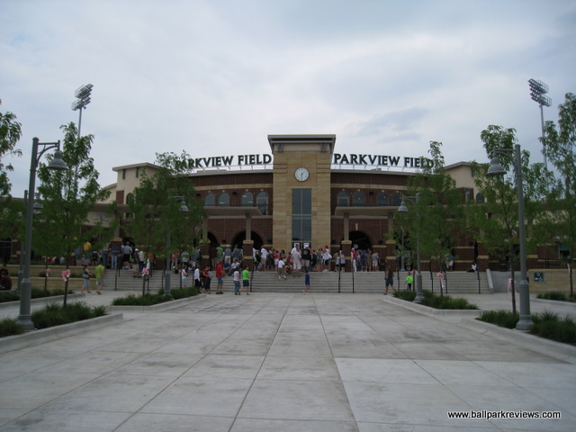 | Hopefully Fort Wayne got it right this time. After building Memorial Stadium in 1993 and getting just 16 years of use out of it, Fort Wayne opened Parkview Field in 2009 as part of the downtown Harrison Square project. Located on the edge of the downtown (bordering a neighborhood), the park is situated to take advantage of the city skyline, though there really isn't much of one. The front of the ballpark features a large clock tower and arched entranceways, thus making it quite attractive. Inside, Parkview Field follows the typical new park template with a wide wraparound concourse overlooking the playing field, though the outfield area is much bigger due to the fact that it contains a “park” area with fountains and also an amphitheater. Seating here was done the right way as the incline is steep and all the fold downs are contained within the infield. This means that sightlines are great. In addition to the traditional fold down seats, there are several other area where fans can sit. These include the grassy berms in left field and right field, the Home Run Porch seats in left field (which feature cushioned seats and counters), picnic areas in the right field corner, rooftop seats in right field (available only to groups) and the “field” boxes along the left field line. These “field” seats include a table with 4 chairs. The Tin Caps deserve some credit for providing the fans plenty of unique seating choices. Parkview Field includes several concession stands along the infield concourse as well as two specialty concession stands in the outfield. One feature BBQ while the other has grilled items. These stands are unique in that they are both constructed of unstained wood, giving them a very distinctive feel. Other food options here include brats, Mexican, wraps, and one stand featuring all apple items – apple sauce, apple pie, apple turnovers, etc. This is a connection to Johnny Appleseed, which is where the Tin Caps nickname came from. Concessions are reasonably priced and of good quality. For the kids who are become restless, there is plenty to keep them occupied. A large kids play area is located in left field and batting cages are located along the concourse on the first base side. In fact you can watch the visiting team take BP in these cages before the game. Overall the atmosphere is very typical. There are several between inning games that are played – dizzy bat race, musical chairs, and balloon toss to name a few, but none are very unique. Some music and sound effects are played, but they fortunately are not too annoying. The team also has a mascot, Johnny. Ushers here are plentiful, but for the most part unobtrusive. Parkview Field is just the first part of the larger Harrison Square project, so the area around the park is still a bit of a construction zone. Parking can be found in surface lots of garages (for $4-5) or on street for free. Parkview Field is definitely a place that Fort Wayne can be proud of, though I'm sure the same thing was said in 1993 after Memorial Stadium opened. Only time will tell how well it will hold up, but for now, this seems like a huge improvement over its predecessor.