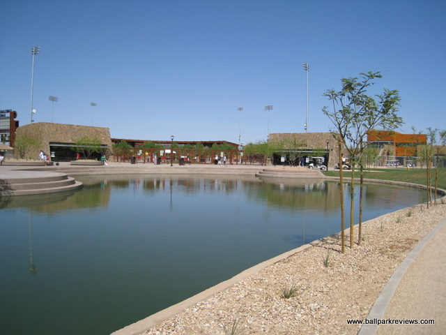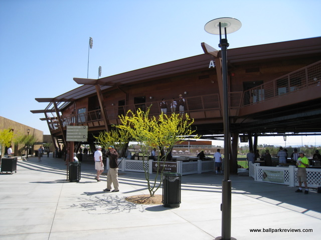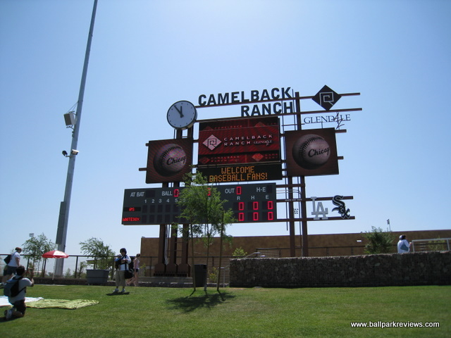 | Camelback Ranch is the brand new spring training home of the Los Angeles Dodgers and Chicago White Sox. And it is probably the most expensive ever built as it came in at a price tag of over $100 million. It is a facility that will serve both the teams and fans very well for many years to come and which will probably serve as a model for other new spring training facilities in the years to come. Laid out on a 100 acre lot of land, the entire complex has 12 playing fields plus the main stadium. Fans are allowed to wonder the complex and watch the players as they practice on the “back” fields. The stadium is among the biggest in Arizona as capacity is 10,000, though more can be accommodated on the large grassy berms beyond the outfield fences. It has a low profile from the exterior, but once inside it is very expansive. The main entrance is actually located in centerfield, right next to the main gift store. A wraparound concourse that is fully in view of the field allows fans to take in the action from many different angles. The “ranch” theme is used throughout the park, but is most noticeable in the look of the luxury boxes which appear as if they were constructed of wood. Seats are all of the fold down variety and are the same color as the seats in the first level of Dodger Stadium. Hence while the ballpark is shared by the White Sox, it definitely feels like the Dodgers are the prime tenant here. This is also noticeable in the fact that there is only one program available for purchase – a Dodgers one. Because of the expansive nature of the ballpark, many of the seats are a long ways from the field, especially those past the bags. Many different food selections are available including Mexican (burritos, tacos), Chinese (sobo noodles), brats, and garlic fries, though prices seemed a bit high and portions on the small side. In fact nothing will come cheap for fans here – from parking ($5) to tickets ($20 - $90) to programs ($5). But so far it has not stopped fans from coming out. As with most spring training venues, the atmosphere is very laid back. Ushers are friendly but unobtrusive and fans seem to be there to watch the game. Because the ballpark lacked any intimacy, I am not that enamored with it. However, the complex overall is great for fans as it allows them to get close to the players in a very relaxed environment. There is no doubt, though, that this ballpark served as a model for future other spring training facilities like those in Fort Myers and Mesa.