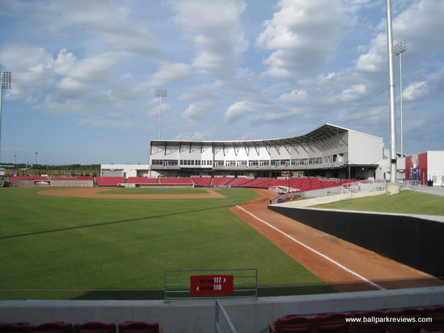| With the opening of QuikTrip Park, Grand Prairie became the latest Dallas suburb to get its own minor league team. Located in between Dallas and Fort Worth, and just a few miles from The Ballpark at Arlington, QuikTrip Park does not break any new ground in terms of ballpark architecture. It most resembles Campanelli Stadium in Brockton with its red seats and metal suite level. Despite a huge population base and a brand new ballpark, Grand Prairie has not been a great draw in its first season. I was not able to get into QuikTrip Park on my 2008 visit. In 2016, Grand Prairie shared the AirHogs with Amarillo - both teams hosting 25 games. This does not bode well for the future of professional baseball here. With weak attendance numbers in recent years, 2016 could be the last season for the AirHogs. Professional baseball did last here thru 2019, but starting in 2021 it was planned to be turned into a cricket venue.