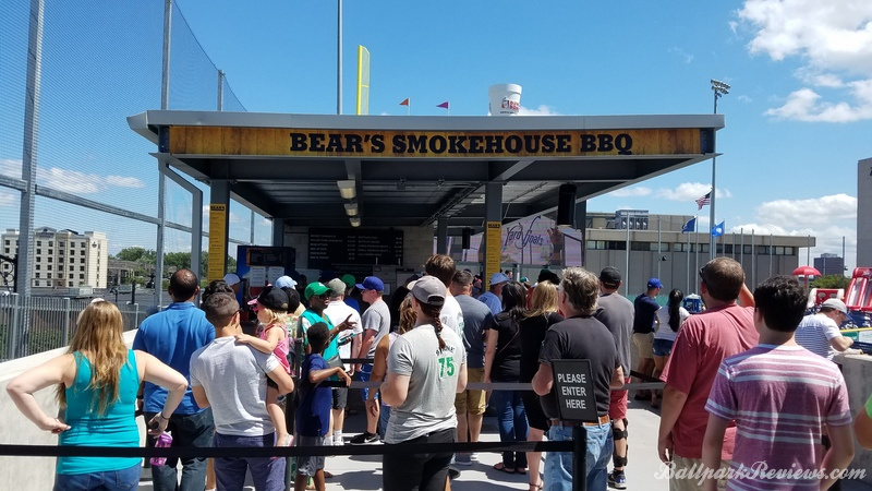 - The most popular food here appears to be BBQ, which is available at the Bear’s Smokehouse BBQ stand down the left field line. Brisket sandwiches ($10), pulled pork sandwiches ($10), and cracklings ($4) are some of the items for sale.