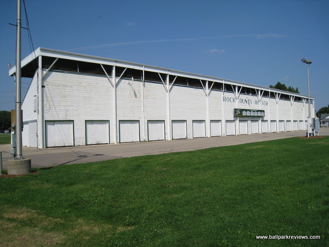 | The Rock County 4H Fairgrounds hosted professional baseball for several years in the 1940's and 50's as a few different Wisconsin State League teams played here. Apparently the large wooden grandstand that still stands today provided most of the seating for the baseball park. No baseball field is on the site today. |
