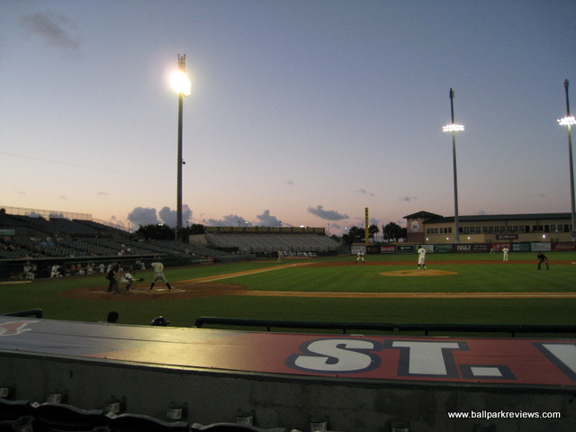 | Roger Dean Stadium is the spring home of the Marlins and Cardinals as well as serving as the home for two Florida State League teams (the Jupiter Hammerheads and the Palm Beach Cardinals). It is not identical to many other new parks that have been built since the late 1990's. The concourse area is located behind the seating bowl and is not within view of the playing field. Also, there are only a few luxury boxes. The location of the park, which was a bit strange when it first opened since it wasn't surrounded by anything, now sits on the edge of the main street and is surrounded by restaurants, condos, and shopping centers. The exterior of the park is beautifully landscaped with palm trees and features a nice red brick facade. The backdrop in both left and right field are the clubhouses. I was able to take in a couple spring training games here in 2000. It is certainly a comfortable place to see a game. But my biggest impression of the place was how expensive everything was. Parking and programs were both $5. Tickets were $15. Compared to other spring training facilities, Jupiter is way off. Maybe it was because the Cardinals trained here and it was at the height Mark McGwire's popularity. But I could have gone to Busch Stadium and see him for cheaper than in Jupiter. Despite the outrageous prices, Roger Dean Stadium is still one of the better Spring Training ballparks. In 2012, I got back here for a Florida State League game. Not much has changed with the ballpark other than its surroundings. Needless to say, the prices and experience at a FSL game are drastically different than those of a Grapefruit League game. Concessions are quite limited (only hot dogs, italian sausages, and brats are available) and the crowds very sparse. The great thing here in Jupiter is that you can see a game almost every day from March through August.