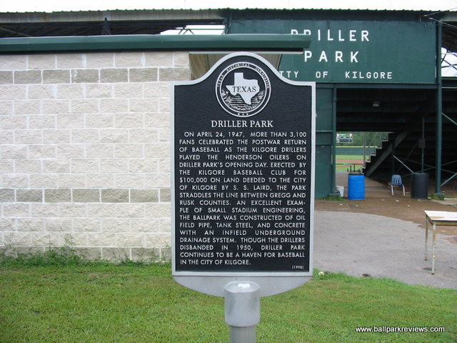 | Driller Park hasn't seen professional baseball since the 1950's, but apparently still gets plenty of use from high school and other amateur teams. Built in the heart of oil country, the grandstand is a vivid reminder of this as oil rigs adorn the exterior of the grandstand. Though the park would probably be suitable for an independent minor league team, the economy in the area is probably not such that it could support one. A nice historical marker, describing the history of Driller Park, was recently erected in front of the ballpark. After being home to the East Texas Pump Jacks, a summer collegiate league team for several years, it is now void of a permanent tenant. Unfortunately, I wasn't able to get inside to take further photos.