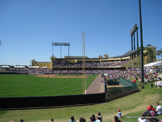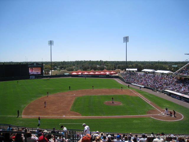 | Champion Stadium does not represent what a spring training atmosphere should feel like. Located in the ESPN Wide World of Sport's complex (which is part of Disney World), there is just too much going on besides baseball, which does not make for a relaxing or laid back environment. Fans can park for free in a large grassy lot, but the walk to the park is a but far. Also beware, egress after the game can be brutally slow. Despite the surroundings, I did like the actual park quite a bit. It is much more intimate than I expected, especially since it has two decks. Seating is made up of mostly green fold downs, but there are also some bleacher seats down the right field line and a large grassy berm which wraps from the third base bag to left center field. Most of the seats provide good sightlines as the pitch of the seating bowl is steeper than in some parks. One problem with the seating, however, is the lack of shade. Only the last few rows of the lower deck are shaded (due to the upper deck overhang) and while the upper deck does have a tressled roof, this really does not provide full shade. Champion Stadium does provide separate concourses for each deck, though the lower one is substantially more spacious. The lower concourse is also two sided, meaning that some of the concession stands are in view of the field. All concession stands have the same appearance, so you'll have to examine the menus to see what each offers. While walking the lower concourse, you probably will feel more like you're in a mall than a ballpark as everything is a bit too shiny. But I guess that's to be expected when you're in Disney World. Also to be expected is higher prices. And that's pretty much true as well. Tickets and concessions are both higher than other spring training parks. Food options include buffalo chicken sandwiches, pulled pork, sausage & peppers, and bacon double cheeseburgers. Unfortunately, none of these items (or hot dogs) can be bought separately - they all must be bought as part of a "basket", which includes fries. This just seems like a way to gouge fans. The quality of the concessions is average at best. Because this is Disney, I guess the Braves feel the need to go overboard with between inning silliness. While I don't mind a little of this, the onfield DJ, who seemed to be screaming the whole time, just made it even more annoying. Apparently she thought the fans were there to see her and not the game. One other small complaint about Champion Stadium - the area behind the right field fence is poorly used. There are small tents parking tents used for Braves coaches and players that litter this area and give it an unsightly feel. Couldn't they have found a better use for this space ? Overall, I do like the structure of Champion Stadium, but the atmosphere is just too "Disney-fied" for my liking. Unless you are a Braves fan or just want to get to every spring training park, I really can't recommend it. It now appears that 2019 will be the last year for the Braves here as they are planning to move to a new spring training facility in North Port. It is unlikely that another team would move here.