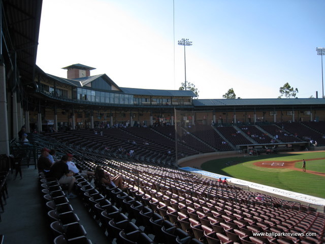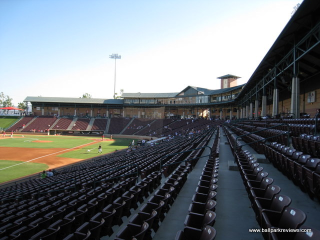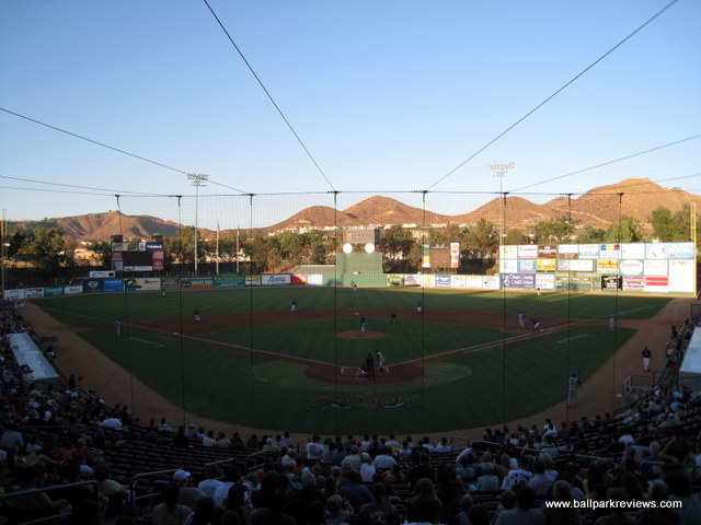 | After reading some negative reviews about Lake Elsinore Diamond, I really wasn't expecting much going in. But I have to say, I was pleasantly surprised, and my visit here was probably my favorite among the parks I saw on my California trip in 2008. The beautiful exterior hits you right away when you arrive. The grounds are immaculately groomed and there are two sculptures, one of a hitter and one of a pitcher, which both light up at night. Upon entering the park, a stunning view of the surrounding hills is the first thing you'll notice – something that is distinctly Californian. The concourse which you enter onto is open to the field and is very spacious. The roof overhead is one of the tallest you'll ever see at a minor league park. Because of the high roof, tall pillars are needed to hold it up, another unique feature of the Diamond. The concourse is kept shiny and very clean, though it is not as lively as it could be. Several concession stands were shut down giving the park a slightly depressed feeling. The seating bowl consists of all maroon fold downs with plenty of legroom and excellent sightlines. Because of the steep pitch of the seats and the fact that there is no center concourse, sightlines are about as good as you can get. Overflow seating can be accommodated on the large grassy berm in the right field corner. Directly above the berm is a picnic area. In the left field corner, there is a large restaurant called the Diamond Club. It is very classy looking and has lots of glass windows for patrons to see the game out of. Concessions at Lake Elsinore Diamond are average at best. The variety is lacking, quality is below average, and prices seemed a bit on the high side. As already mentioned, a few of the concession stands were closed the night I was there, so perhaps the variety is better on busier nights. The team has been having some financial issues in recent years, so perhaps concessions is one area they feel they can make some money. As for the atmosphere, it was much better than I expected. I had heard it would be over the top, but was really not too bad. The team only did a couple between inning contests : race the mascot, bungee pull, and a golf game. There was also a couple of “skits” featuring a dancing gorilla, which apparently is a fan favorite. The Storm have two mascots, one of which is a pink bunny named Jackpot who pops out of the scoreboard whenever the home team scores a run. The only negative aspect about the atmosphere is that the sound is cranked a bit too loud, especially when the Storm are up at the plate. Another unique aspect to this ballpark is the manual scoreboard in right field – a very nice touch that I always appreciate. One other small complaint – parking is $5, which is a bit steep. On the plus side, programs are free. Lake Elsinore Diamond is definitely unique and memorable, which is probably why I enjoyed my visit so much. Some improvements are needed in the area of concessions, but otherwise this is a fine place to see a game.