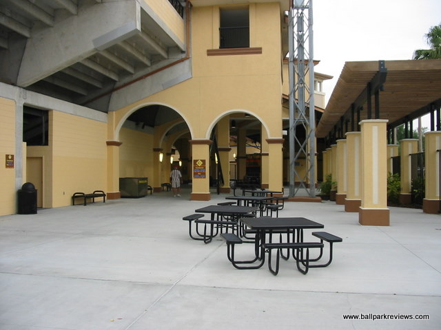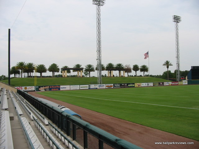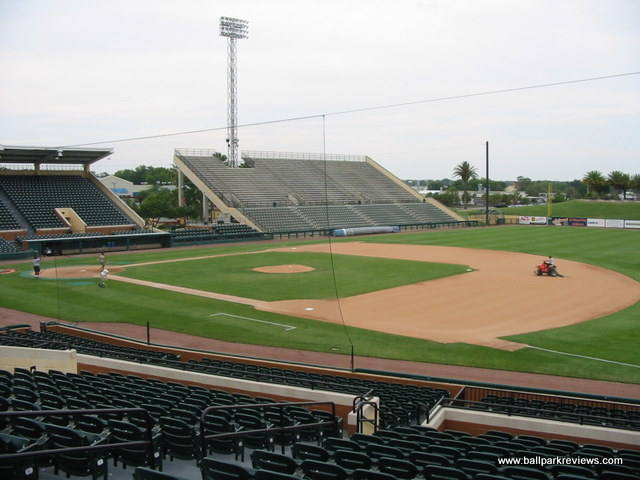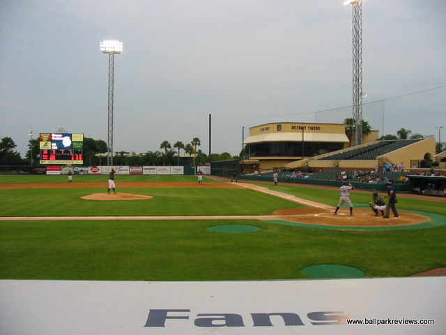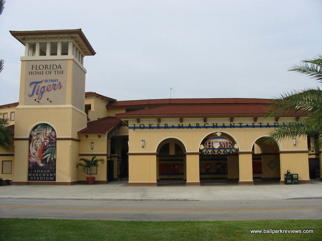 | After attending games in Clearwater and Tampa the previous day, taking in a ballgame at Joker Marchant Stadium was a refreshing change. Situated in a residential area away from the busy strip, the laid back atmosphere is how a spring training park is supposed to feel (even if I was attending a Florida State League game). Having never seen the park before the extensive renovations in 2003, I can only assume that the park has been enhanced greatly without losing much of its charm. A tan stucco exterior meticulously landscaped with palm trees is the first thing that catches your eye. And the interior is just as nice. The main seating bowl consists of all green fold down chairs, split by across aisle which leads to the concourse. A large bleacher section along the third base line and a grass berm behind the left field fence complete the seating, though these are off-limits during the minor league season. The concourse is located behind the grandstand, out of sight from the field. It contains numerous concession stands and kiosks, most of which are not open during the FSL season. With the nickname change to "Flying Tigers", the Lakeland franchise has embraced the military theme. This can be seen in the concession options (i.e. the "torpedo" dog) to the names for the stands ("Mess Hall"). Also, the night I attended, all the game day personnel were dressed in fatigues. One odd quirk of the ballpark is the large fence that has been erected in front of the first base stands. Apparently this was put in to protect fans from overthrows as the seats are especially close there. But how many overthrows from infielders go into the stands ? Not many that I've seen. This seems like a lame excuse to obstruct the views of these otherwise great seats. Compared to other FSL parks, concessions at Joker Marchant are well varied and quite tasty. They include italian sausages, burgers, and chicken sandwiches. The atmosphere of the park matches the peaceful setting. While some between inning games are done (race the mascot, dizzy, t-shirt toss), there are no blaring sound effects and all music that is played is old-timey. The team does have a mascot, Southpaw, but he only made one brief appearance. Like most of the FSL teams, Lakeland does not draw well. But even without many fans in the stands, I enjoyed the atmosphere a lot more than in other places like Sarasota and Tampa. Joker Marchant Stadium is just a charming place to take in a game on a summer evening. In 2017, another major renovation was completed which includes the demolition of the large bleacher section down the left field line. This reno will ensure the Tigers train here for many years to come.