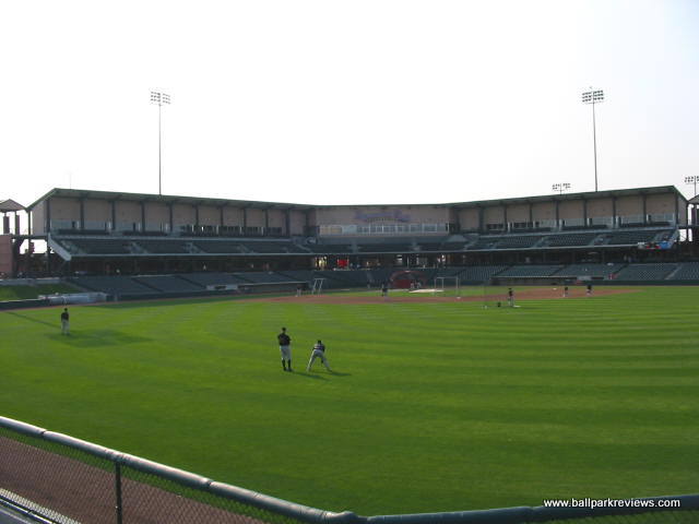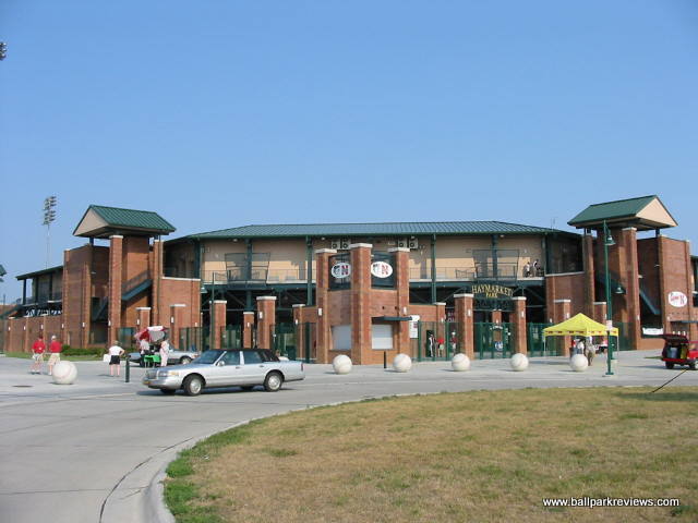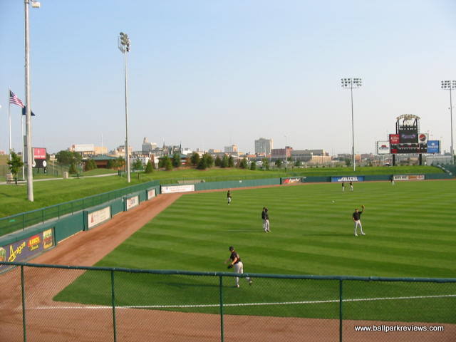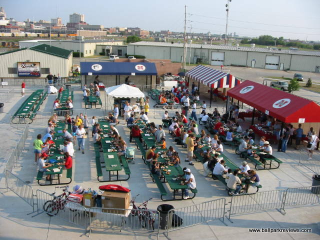 | Haymarket Park is like a smaller version of Victory Field in Indianapolis. It uses a familiar template, but includes a small upper deck, which really distinguishes it from other new parks. The park has a great location as it overlooks Memorial Stadium (where Nebraska plays their football games) and the Lincoln skyline, including the state capitol. The concourse is open and wraps all around the park, meaning there are plenty of grassy berms for overflow crowds. Sightlines are great - the lower level seats are very close to the field, and even the upper deck seats don't feel like they are too far from the action. The luxury boxes are located at the top of the upper deck. Concessions are well varied and very reasonably priced. Their specialty item is the Runza, which is a sandwich stuffed with meat and spices. Apparently Runza is a restaurant chain in Nebraska. I enjoyed the atmosphere of Haymarket Park quite a bit. There were very few sound effects and the musical selections included some organ music. Instead of between inning contests, the team loves to shoot hot dogs into the stands. I guess they need to justify the money they spent on the huge shooter used to launch the hot dogs. The team has a mascot, "Homer", but he wasn't around much. Parking is plentiful and free. Overall, Haymarket Park is a refreshingly different park with a very nice setting and a relaxing atmosphere. Certainly one of my favorites.