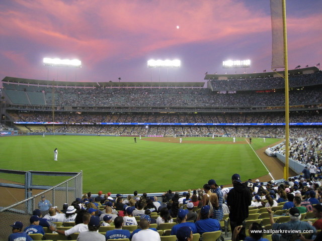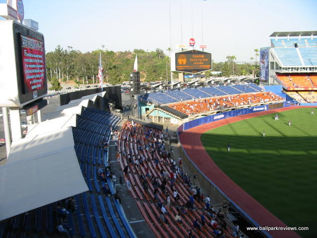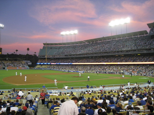 | If you want to see all of Dodger Stadium, it will probably take you multiple visits since the Dodgers really don't urge fans to explore the park. In fact, fans are supposed to stay on the level where their seats are. Now that I've been to Dodger Stadium twice and seen the main level, I can confirm that this is a fine ballpark and one that has held up well to the test of time. I'm not exactly sure of the reason why fans are not allowed in every area of the ballpark , but one explanation could be that they want to protect all the Hollywood celebs from being hounded by regular fans. Whatever the reason, it gives Dodger Stadium a very elitist feel. The stadium is set to the north of the city on what was previously a landfill. The exterior of the stadium is well landscaped and features large murals of Dodger greats to celebrate their 50th year in Los Angeles. Parking, which used to be confusing to navigate and which created some big traffic tie-ups after the game, has been greatly improved in 2008. It will cost you $15 to park, but the egress is now now very easy. Even with a large crowd the night I attended in '08, I was out of the parking lot within 15 minutes. To discourage tailgating, parking lots only open 2 hours before the game. Despite being over 40 years old now, it is still a good place for seeing a ballgame. Sightlines appear to be good from most angles and the upper decks do not feel nearly as high as in the newer parks. Most of concourses are open to the playing field, which is certainly a rarity in such an old park. The nicest concourses (not surprisingly) are located on the field level, though they are a bit narrow. With large crowds, they can be tough to navigate during the game. In the area of concessions, there is a great variety of options, but because this is Southern California, prices tend to be on the high side (i.e. $5.75 for a bottled water). The infamous Dodger Dogs are grilled, but rather bland in taste. Other concession options include Subway, Mexican, Carl Jr's, California Pizza Kitchen, Chinese, sausages, and garlic fries. The atmosphere is interesting as Dodger fans are famous for showing up late and leaving early. Though I really haven't noticed that too much on either of my visits. During my '08 visit, the fans, though a bit belligerent at times, were mostly into the game. The setting for Dodger Stadium is gorgeous as it is surrounded by the Elysian hills and the San Gabriel Mountains. The Dodgers have to be commended for keeping the ballpark in great shape – it really does not look anywhere near its age. And they are planning on pouring another $500 million in renovations into it that will be completed by 2012. Dodger Stadium is certainly a great place to see a game, but I just wish they would make it a little less restrictive.
