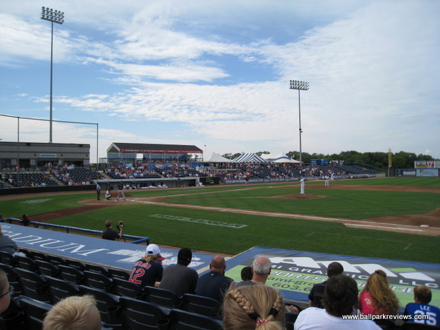 | While I had been enjoying some of the new Frontier League parks, they are now all becoming a bit too similar and I’m not sure that the template they are using works that well. Road Ranger Stadium, located in Loves Park (not Rockford), is built along the same lines as other FL parks in Sauget, O’Fallon, Avon, and Traverse City, but does doesn’t have any of the character that those parks possess. It is a comfortable and relaxing place to take in a game and is perfectly functional, but there is nothing that makes it memorable. Located right off of I-90 north of Rockford, the ballpark was built in an open field, with basically nothing surrounding it. The gray brick exterior with an arched entryway does make Road Ranger Stadium attractive for passerbys. Unfortunately, the inside of the park is a bit drab and could use an infusion of color. Fans enter directly onto the spacious concourse which overlooks the playing field. The concourse, however, does not ring the entire park, a feature I like to see at new parks. The main structure of the ballpark is just a single deck (no luxury boxes here) containing two concession stands, a team store, and a single set of bathrooms. The press box is a separate structure located along the concourse, just to the third base side of home plate. Seating here is all blue fold downs. There is no general admission or berm seating. An all-you-can-eat pavilion is located along the third base side along with several picnic tents. Also, behind the right field fence is a picnic / grill area which is open to the public. While I’m sure some love that all the seats are close to the field (there are just 10 rows of seats in all sections), I’m not a fan of this design. For the sections of seats that are located past the dugouts, the sightlines are lousy. It is especially true at Road Ranger Stadium where none of the sections are angled in towards the infield. So if you’re sitting in the last section (near the foul pole), your seats are pointed directly towards center field. Not ideal for watching a baseball game. Concessions here are well varied and reasonably priced. Some of the unique items they offer include pork chop sandwiches, Italian beef, and Culver’s frozen custard. The atmosphere on the whole is very laid back, making for a relaxing night at the park. The sound system is not cranked too loud and the sound effects are kept to a minimum. Also, the PA announcer is lively without being too over the top and keeps the focus on the game. Several between inning games are contested including the mascot bike race, the chicken toss, and the “Dress like a Riverhawk”. The only complaint I have with the atmosphere is the mascot, Rocko (an ugly bird-like creature). For one whole inning he teased the crowd with t-shirts. This allowed kids to scream and adults to be annoyed. There is no need for this type of behavior while the game is being played. A kid’s play area is located in the left field corner. Included is the “Riverhawks Express”, a train which takes fans on a short trip around the parking lot. This is a neat idea, though I’m not sure what the point is exactly. The one other complaint I have with this ballpark is the complete lack of covering anywhere. If it’s hot and you want shade and or it’s raining and you want cover, there is none to be found. This to me is a serious design flaw. Road Ranger Stadium is a functional ballpark, which is an improvement over its predecessor, Marinelli Field. But the lack of much character makes it a rather forgettable park. Apparently many fans felt the same way as attendance dwindled to the point of the team folding after the 2015 season. Starting in 2016, a Northwoods League (summer collegiate) took up residence here.