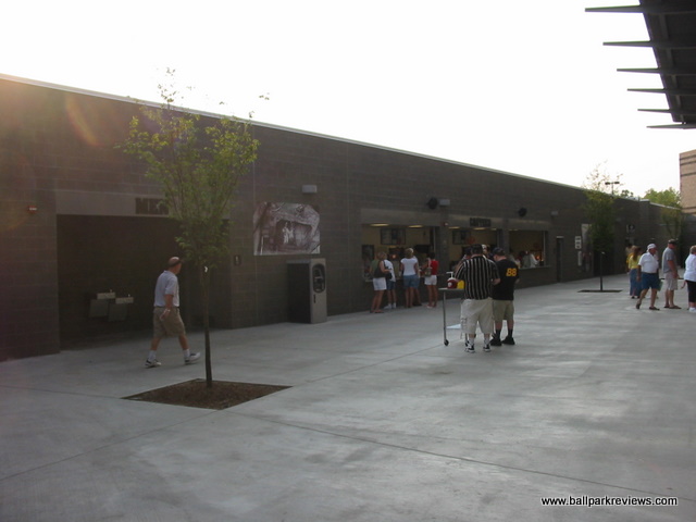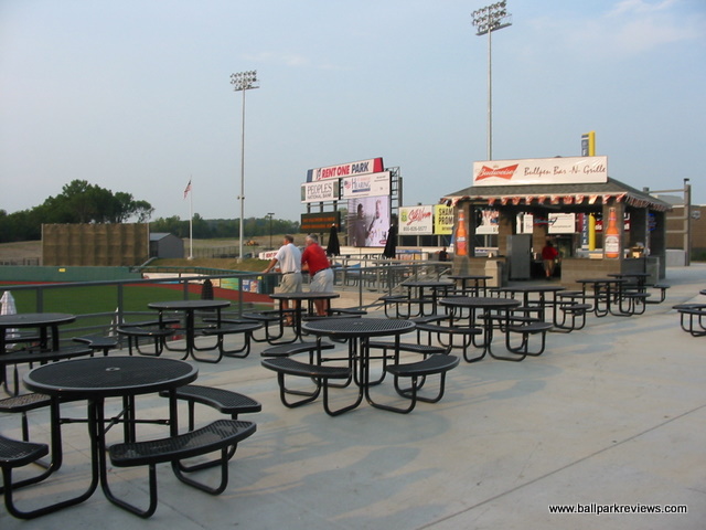 | If you like artificial turf, then you're in for a real treat when you visit Rent One Park. Not only is the grass fake, the dirt is also fake. That's right - the baselines, the pitcher's mound, the home plate area, the warning tracks. All artificial. It certainly makes for a different experience while watching the game, and probably not one I'd like on a regular basis. Once you get past the fake field, however, Rent One Park is a fine new ballpark. It is located in a growing commercial area, west of the city of Marion. Because it was built in a big empty space, there is no backdrop to speak of. The exterior of the park is a rather boring gray brick with no signage indicating what the name of the park is or who plays there. Inside, the design of Rent One Park follows the common template used nowadays with an open concourse overlooking the field and luxury boxes stacked overhead. The concourse is very wide and spacious, though there seems to be too much dead space on the third base side. Currently the concourse does not wrap all the way around the ballpark, but it clearly could at some point in the future. Seats are all of the green fold down variety, with season ticket holders getting cushions with theirs. Picnic areas are located in center field and in the right field corner. There is also a grassy berm in left field, though when I visited in late August, the grass was completely brown. Perhaps the team has no way of watering the grass since they don't have to worry about the field needing water. Maybe they should just put artificial turf in the grassy berm as well ! A large gift store is located off the concourse and typical of most first year teams, prices were quite high on most items. The team does give out free scorecards, however, which is a nice touch. Concessions is one area that could probably be improved on. The overall variety was rather limited and the quality was average at best. I always like to see teams have a signature food item, but there are none to be found in Marion. The atmosphere, as with most teams in their inaugural year, is a bit over the top. The music is cranked too loud and the PA announcer is a bit too enthusiastic. There are also four mascots (a miner, a bird, a mole, and TNT) on hand to entertain the fans, which they did quite well. Also, the team does a few of the typical between inning games. Certainly the fans of Southern Illinois have taken an immediate liking to Rent One Park as they easily broke the Frontier League attendance record in their first season. The ballpark doesn't break any new ground or have any unique features (unless you're fond of the artificial turf), but it's a comfortable and pleasant place to take in a game.