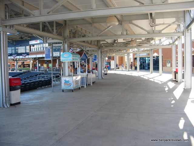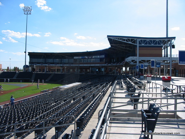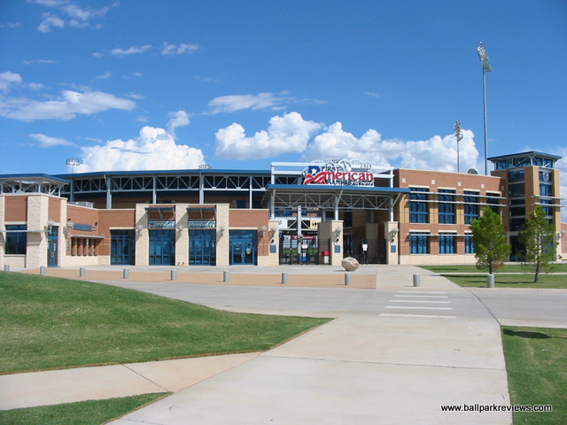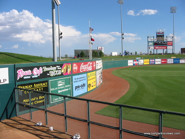 | Security Bank Ballpark is a nice enough new ballpark, but one that simply failed to excite me. Maybe it's because the setting is so boring. Or maybe it's just because it follows the same template that dozens of other new ballparks have followed. It is set on the west side of town in a big parking lot next to a football stadium that was built at the same time. Both have nice brick exteriors that complement one another well. Inside, fans enter on the concourse level which overlooks the field. Luxury boxes are stacked over the concourse and a roof extends over the suites as well as the last few rows of seating. Seats are all fold down blue chairs. While all seats are close to the field, almost all sightlines are obstructed by the netting which runs to the end of each dugout. As is becoming customary at new parks, the concourse circles the entire park allowing for grassy berms for fans to sit on during the game. Because there were no space restrictions, the architects made a wise decision to set some of concession stands back from the concourse. This serves the dual purpose of relieving congestion and allowing the winds to move through the ballpark and cool it off some. Unfortunately, the architects also got a bit too cute in places, i.e. the bullpens create juts in the outfield fence that are unnecessary and feel purely contrived. Concessions at Security Bank Ballpark are quite good - prices are cheap and the quality is above average. Selections include BBQ, pizza, Mexican, and Chick-Fil-A. In addition to the usual concession stands, a restaurant (which is open to the public) is also located behind homeplate. The atmosphere in Midland is an interesting one - fans seemed to arrive late, but once they showed up they were very vocal. The team used the typical between inning contests to entertain the fans - Race The Mascot, Dizzy bat race, Let's Make A Deal, etc. Overall, First American Bank Ballpark is a pleasant place to see a game, but I found there was little to distinguish it from numerous other new parks.