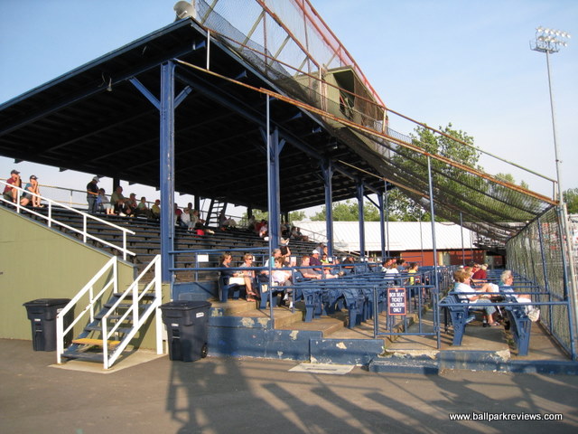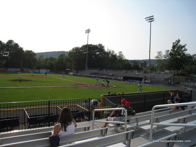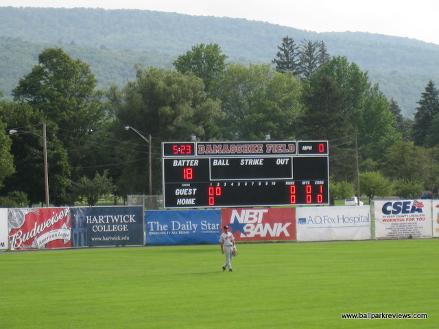 | This is minor league baseball at its purest. Damaschke Field is a cozy little park, just half an hour away from Cooperstown. There are no promotions, no fancy scoreboards (though a new one was installed in '03), and no wacky sound effects. The team claims to have a mascot named Sam (a tiger), but I have yet to see him. What takes place here is just baseball. A covered grandstand sits behind home plate with a few box seats and backless benches. There are bleachers that run down both foul lines. The thick screening (more like a fence, than a screen) behind home plate can be obstructive at times, but adds to the uniqueness of this old park. Concessions are limited, but very reasonably priced. This also continues to be one of the only parks in the country that doesn't serve alcohol as the owner is trying to make the atmosphere as family friendly as possible. A very easy place to obtain autographs as the players must walk right by the stands to get from the clubhouses to the field. The backdrop is quite scenic, with mountains beyond the outfield fences. In this age of new ballparks popping up in almost every city, Damaschke Field doesn't seem suitable for affiliated minor league baseball, but as long as Sam Nader continues to own this franchise, it will continue to host a professional team. And that's fine by me, as Oneonta is the perfect place (with its proximity to Cooperstown) to host a pure baseball experience. Some badly needed renovations were completed before the '07 season. These included new bleachers (with backs) on the 3rd base side and a new building which houses the clubhouses, the main concession stand, and the bathrooms. In addition, the parking lot was moved closer to the ballpark and the exterior was painted and dressed up a bit. These improvements have certainly made Damaschke Field a more comfortable place to take in a game. Unfortunately, Sam Nader sold the team before the 2009 season and the new owner lied about keeping the Tigers here through at least the 2010 season. The Tigers moved to Norwich and Oneonta is now left without professional baseball. What a shame.