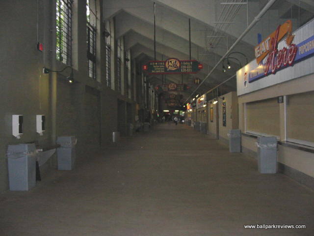 | Why aren't more fans coming out to see games at this great old minor league ballpark ? If Portland wants to be a major league city, they will have to draw better. It's a bit puzzling, especially after a $40 million renovation in the late 1990's. The park is nestled in the downtown and fits right in, mostly because it is sunk some 40 feet below street level. This allows passersby on the street to peak in through the wrought-iron fence and see the game from the outfield. The two main entrances (one in left field and one behind homeplate) each feature a small courtyard and are almost identical in appearance. Once inside, the physical structure of the park is quite impressive. A large roof covers over 90% of the 23,000 seats. The seating is split by a center aisle that leads to the concourse area. Seating above the center aisle is wooden benches with backs. Lower seating is all folding green chairs. Luxury boxes are stacked 4x4 behind homeplate with a few additional ones located on the field level. The seats are a bit far from the field and the upper sections have poles which could obstruct some views. The concourse area located underneath the grandstand is bright, clean, and plenty spacious. Concession stands and a small team store are located on the concourse. There is a limited variety of concessions at average prices. Two picnic areas are located field level and an additional one is located in left field, high above the field. Interestingly, there is no real press box here - instead just a table is setup on the center aisle in front of the luxury boxes. The atmosphere is pretty minor league here - many between inning contests were done, but fortunately sound effects were non-existent. While most AAA parks now have a fancy video scoreboard, you won't find one at PGE Park. Instead, they have a large, hand operated scoreboard in left field - all information is changed manually, from the count to the score to the number of the batter. It is quite neat to see it in action, and a refreshing change from the video boards found at newer parks. I only found a couple negatives about the park. First, why do they need artificial turf ? Secondly, parking is very limited, and what can be found is expensive ($4-$7). Maybe MLB will give Portland a chance to host some Expos games in 2004 - PGE Park is certainly no worse than the park being used in Puerto Rico. But maybe it would be better for Portland to stay AAA - that way one of the classic minor league ballparks could remain in use. It is one of the few relics left in this country. Unfortunately, the Beavers left town after the 2010 season when the city decided that hosting a pro soccer team was more important. PGE Park (as it was last known when hosting baseball) will no longer host baseball and one of the nicest cities in the U.S. is left without the national pastime. For a panoramic of the exterior, click here.