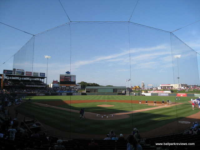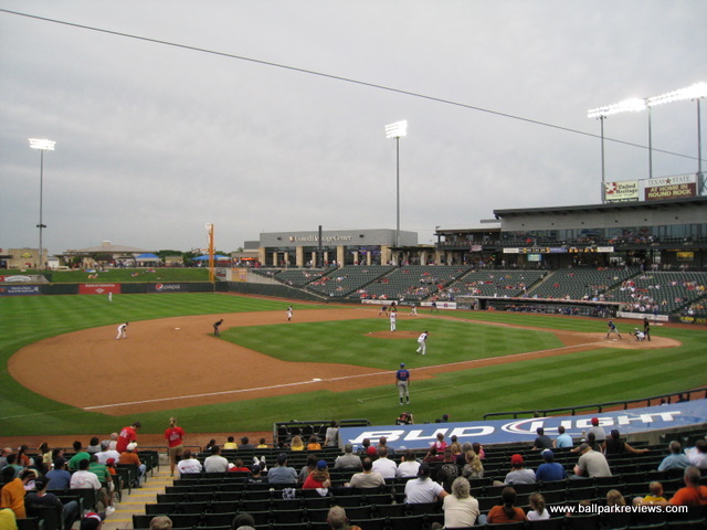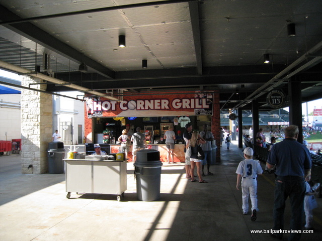 | Round Rock, a suburb of Austin, lured the Jackson, Mississippi franchise here for the 2000 season. The team got a lot of attention initially because of the team name, the Express, which came from the nickname of the team's co-owner, Nolan Ryan. The Dell Diamond is a beauty, though the setting leaves something to be desired. It is located on a busy road (Rt 79) on what seems to be the edge of town, some four miles off of I-35. Apparently it was built in what had been just an open field. Originally built for AA baseball (the Express moved to the Pacific Coast League in 2004), The Dell Diamond is pretty similar to other parks that have been built since 2000, though on a slightly larger scale. It is built into a bowl with the concourse overlooking the field. and luxury boxes located directly above the concourse. The seating sections stretch from foul line to foul line and are all green fold down chairs. The seats past the bags are angled towards the infield, allowing for a good view of most of the action but completely obscuring any views down the lines in the outfield. Additionally, there is a large seating deck in left field which is referred to as the "home run porch." It is very similar to the right field deck at Rangers Ballpark in nearby Arlington, only on a smaller scale. It is probably the park's most distinctive feature. Another cool feature is the wooden rocking chairs that are located underneath the deck - the only other park I have seen something similar at is Banner Island Ballpark in Stockton. The outfield also contains large grassy berms for overflow crowds (which apparently are quite frequent here). Because of the outfield seating, the concourse wraps completely around the ballpark - a nice feature for sure. The only problem is that the concourse closer to home plate can get very cramped and therefore is not conducive to wandering around on during the game. This is because all the concession stands are built perpendicular to the field rather than parallel to it. There is a backside to the concourse, but it seems to be underused and mostly a haven for smokers. This seems to be a design flaw, though the same ownership group used a similar design in Corpus Christi and it turned out much better. Concessions here are outstanding - the variety is great and the quality is high. You may pay a bit more for the food, but it is well worth the price. Some of the unique items the Express offer are turkey legs, sausage on a stick, "Nolie" burgers, Pok-E-Jo's BBQ (inlcuding smoked turkey sandwiches), and garlic fries. A decade into their existence the Express continue to be a great draw at the gate. It is easy to see why with all the fan-friendly amenities they have. There is a large play area for kids in centerfield and a pool available for group rentals in right field. There are also several other group areas available. As with most AAA parks, the experience is mostly geared towards the game on the field. A few between inning games are performed and the team plays lots of unique movie and tv clips between batters, but the Express certainly do not go overboard. Overall prices seem a bit high here ($14 for all box seats, $5 for parking), but this does not seem to keep many fans away. All in all, The Dell Diamond is one of the finer minor league ballparks in the country - a lively atmosphere, tasty concessions, and well maintained amenities combine to make it a top-notch facility.