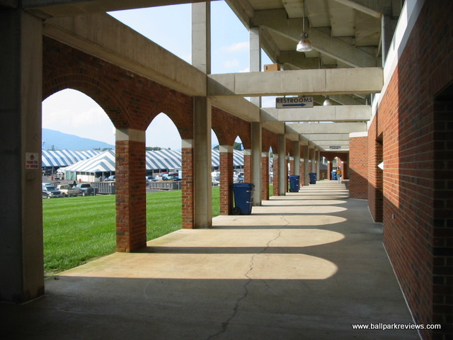 | Salem Memorial Stadium replaced old Municipal Field in 1995, which had served its purpose well for many years but was no longer suitable for affiliated minor league baseball. Because Memorial Stadium was built prior to the big building boon in the late 1990's and early 2000's, it does not follow any specific template. Its location in an open area next to the city's civic center and football stadium allow for an unobstructed view of the Blue Ridge Mountains over the right field fence. Seating (which is all fold down chairs) is made up of three levels : box seats, reserved, and general admission. Sightlines are fine from most seats, though the field is a bit distant from many of the GA seats. You'll want to sit on the third base side to get the best view of the mountains. The main concourse which runs behind the seating area is mostly not in view of the playing field. For this reason, the team has put the bulk of their concession stands in the open area of the concourse behind home plate, which is in view of the field. Concessions are well varied - unique items include Buffalo burgers and BBQ sandwiches. The prices are quite reasonable and quality is above average. A nice team store is located in a building adjacent to the ballpark, but is accessible from the concourse on the third base side. Overall, the park has a very open and airy feel to it. Even the concourses are not completely enclosed. The atmosphere is very typical of most minor league parks, especially in the south. Sound effects were kept to a minimum and the standard on field contests were done between innings - race the mascot, dizzy bat race, sumo wrestling, etc. The team also has two married mascots (Mugsy and Misty), but they were not too active the night I was there. While the structure of the ballpark is not the best, the scenic location and laid back atmosphere make this a fine venue to take in a ballgame.