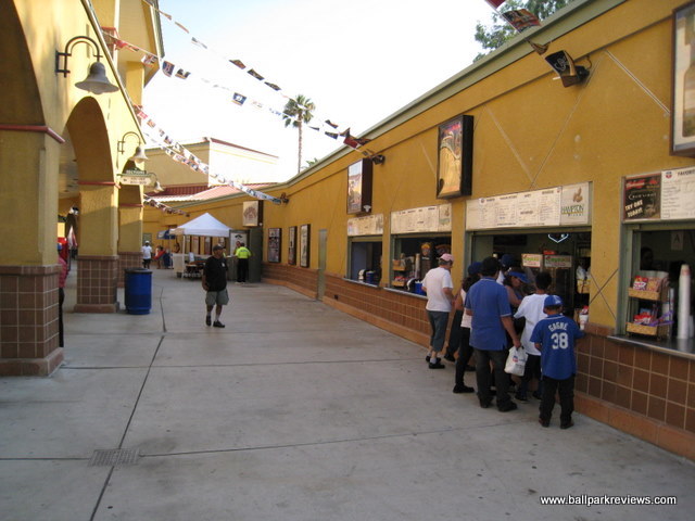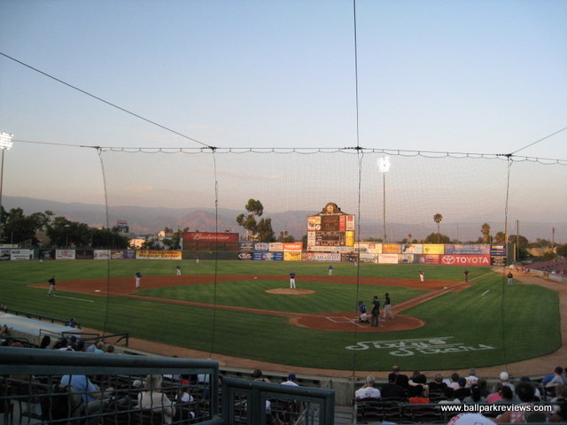 | When you come upon Arrowhead Credit Union Park, there is little mistaking that you are in California. The yellow adobe facade (resembling a mission) and the nicely landscaped exterior with palm trees makes it distinctly Californian. And the same goes for the inside of the park – the San Bernardino Mountains make for a beautiful backdrop. The design of the ballpark doesn't follow the typical new ballpark template with the concourse overlooking the field, but it does mimic the designs of the ballparks in nearby Rancho Cucamonga and Lancaster. So perhaps this design is just a popular trend in California. The concourse area, located behind the seating bowl, is very spacious and is open air due to the absence of any rain. This differentiates it from ballparks in other parts of the country with the same design. Concession stands line the concourse and offer an excellent variety of food options. Included are specialty burgers, tri-tip sandwiches, baked potatoes, Santa Fe nachos, and Mexican (burritos and quesadillas). Quality and prices are about average. Though on the Friday night I attended, they had a great deal – 50 cent hot dogs and quesadillas. This certainly seemed to bring out a lot of fans who were just interested in eating. Another food option is the Pastimes Cafe located down the left field line. The seating is broken into two types – field box seats which run from foul pole to foul pole and reserved seats which are located behind home plate, above the walkway. Unfortunately, many of the sightlines are not so good. The seats past the bags are just too far from the action and the seats in the reserved section are obstructed by many unnecessary railings. A grassy berm is located behind the left field fence for overflow crowds. In addition, there are large picnic areas located behind the seating areas on both the first and third base side. Unlike the picnic areas at most ballparks, these actually provide a pretty good view of the field. Luxury boxes are located at the top of the grandstand. The atmosphere at Arrowhead Credit Union Park also has a rather Californian feel to it, mostly due to the presence of a dance team / cheerleaders. As the home team players were introduced, they ran through the dance team who were lined up with their pom poms. I wasn't sure if I was at a baseball game or a college basketball game, especially since they also performed several dances between innings. There was lots of music played between batters, but sound effects were almost non-existent. Several unique games were played between innings including a toy pickup, a remote car race, and a keg rolling contest. The 66ers also have a mascot, Bernie, who is quite active, but also a bit annoying. He is constantly letting out these little screeches and was dancing on the dugout during the inning, which is a no-no in my book. I do have to compliment the ushers, however. They really seemed interested in ensuring that everyone was enjoying the game. When some fans started to get obnoxious and rude, the ushers politely asked them to settle down. I do have a couple of small complaints about the park, though. First, a new video board is needed – the one they have now is dot matrix and can't be seen until it gets dark. Secondly, there is a bit too much unpainted concrete, especially below the luxury boxes. Would it be asking too much to hang some banners there ? Overall, though, I really did enjoy my visit to San Bernardino. Arrowhead Credit Union Park is clean and fun and the setting is beautiful.