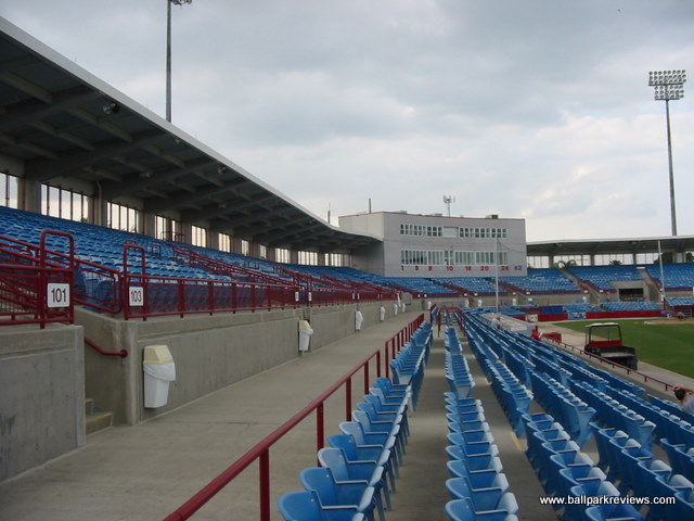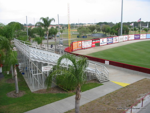 | When you're in Florida, it's not hard to find minor league ballparks. But finding one that provides a good atmosphere and which draws some fans is a bit more difficult. If you attend a game at Sarasota's Ed Smith Stadium, you'll want to keep searching. Among all the minor league ballparks I've attended games at, this is one of the most depressing. The park is just too cavernous and has too much concrete, characteristics that are magnified when crowds are rarely more than 500. Ed Smith Stadium opened in 1988, meaning it feels a bit outdated now. But it is still a perfectly fine venue. The seating bowl is split into a lower and an upper section by a narrow walkway which leads to concourse. The seating extends almost from foul pole to foul pole, meaning many seats are close to the field, but also that many are far from the infield where the majority of the action is. Except for small bleacher sections in both the LF and RF corners, all seating is plastic fold down chairs. They are probably still the original seats as they look very weathered and should probably be replaced. A small roof does cover the back half of the upper level seating, so at least shade is available for those who want it. The uncovered concourse runs behind the grandstand (out of sight from the field) and features several concession stands and a small souvenir kiosk. Concessions are somewhat limited for FSL games as the most unique item offered is the "Big Red Smokey" (a sausage). Prices are a bit high and quality is below average. Clearly the team isn't trying to bring in fans by offering cheap or tasty concessions. With such small crowds, it is not surprising the atmosphere is not at all lively. The team does do a few between inning contests, but just trying to find fans willing to compete in them must be difficult. There has been talk in recent months about building a new spring training park for the Cincinnati Reds, but it doesn't look likely that it will happen. There is nothing inherently wrong with Ed Smith Stadium, so I would think money would be better spent renovating it. Even with a new park, it's unlikely the Sarasota Reds would draw any better, as it's clear the team isn't making much of an effort. Unless you're a real hard core baseball fan, Ed Smith Stadium is probably one you'd be better off seeing during spring training rather than for an FSL game. At least then there might be some fans in the stands. The Reds finally did get their new spring training ballpark, but in Arizona. In 2010, the Orioles moved their spring training operations to Sarasota and in 2011, a $30 million renovation of Ed Smith Stadium was completed, which completely refreshed the look of these once bland ballpark.