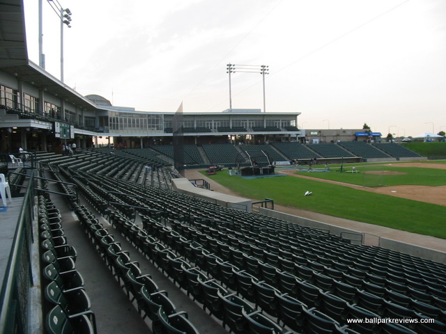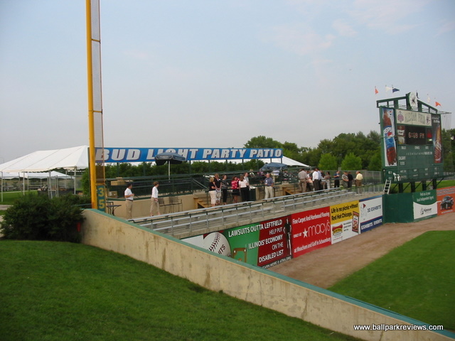 | Alexian Field (as it was originally known), located in a northwest suburb of Chicago, has been referred to as a "mini Wrigley Field", but from the naked eye, the resemblances to the Cubs ballpark are few. That said, this is still a fine ballpark, especially for the independent Northern League. Its suburban location makes for a rather boring setting as it's basically just surrounded by parking lots (parking is free) and highways. There is also a small airport nearby, so planes can be seen going overheard quite frequently. The ballpark itself resembles numerous other parks built since the 1990's. Fans enter onto a concourse that overlooks the field and there are luxury boxes stacked above. Unfortunately, it does not have a full wraparound concourse. There are grassy berms down each line and a picnic area behind the left field fence, but the concourse does not continue into the outfield. The concourse also feels a bit narrow in spots, even when there aren't big crowds on hand. The seats are green fold downs, so you'll be comfortable wherever you sit. Sightlines are good, but there is a bit too much foul territory for my liking. The similarities to Wrigley come in the dimensions of the park, the first base dugout (which is crooked), and the manual scoreboard in left field. Concessions are well varied and quite tasty, but the prices a bit high for the minor leagues. Some of the unique food items include brats, cheddar sausages, and Italian beef sandwiches. There is also a restaurant on the suite level which is open to the public. The atmosphere is pretty laid back, due mostly to the organ music that is played instead of the normal pop and rock music. The Flyers have a mascot, Bearon, who works the crowd pretty well. There are also a few between inning games, the most interesting of which was "Dress Like a Hooter Girl", which pitted two guys going head to head. Alexian Field is a looking a bit worn, so some upgrades may be in order. Sometimes I think teams don't think new parks need to be spiffed up occasionally, but they in fact do. Still, Alexian Field is a comfortable and pleasant ballpark, but there just isn't much memorable about it. In 2011, nobody will be creating memories here as the Flyers folded. Fortunately a new team, the Boomers, launched in 2012.