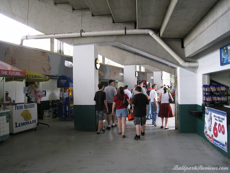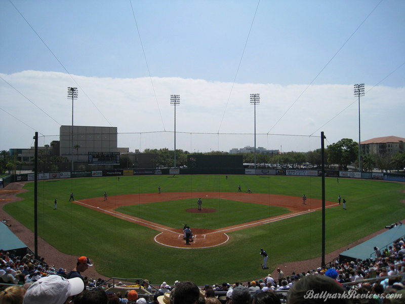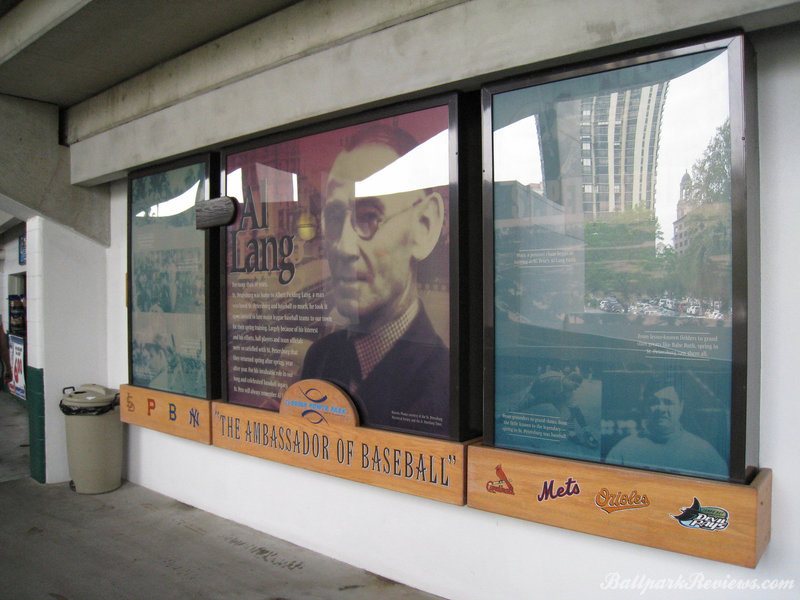 | The best aspect Al Lang Stadium, is its location. It is set right on the bay, so one can see the ocean as well as numerous sailboats over the outfield fence. Also, it is just 12 blocks from Tropicana Field where the major league team plays. It is strange seeing a minor league park so close to a major league one. The park itself is unique in that it features a cantilevered roof that covers approximately half the seating area. It was actually rebuilt in 1977, so features more concrete than I would prefer to see. In addition to the main seating bowl, there are small grassy berms in left field and right field where fans can watch the games from. Most of the seats offer an excellent view of the field as the pitch of the seats is quite steep. The concourse is located behind the seating bowl, out of view from the field. It features numerous concession stands, but can become very cramped with big crowds on hand. There is a good variety of food options available : Italian sausages, foot long dogs, burgers, chicken sandwiches, etc. Concession prices are quite reasonable for a spring training venue. Parking is available in parking garages and surface lots within walking distance. No longer home to a Florida State League team, it now just serves as a spring training facility. But after the D-Rays moving spring training to Port Charlotte in '09, Al Lang Stadium received little more use as a baseball park. While there was some thought to building a new ballpark for the Rays on this site, those plans never came to fruition. Instead, this ballpark was converted to a soccer-only facility, where it has received a second life.