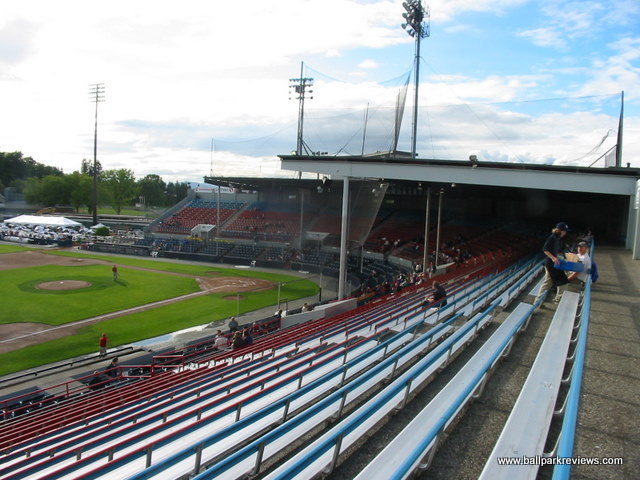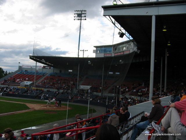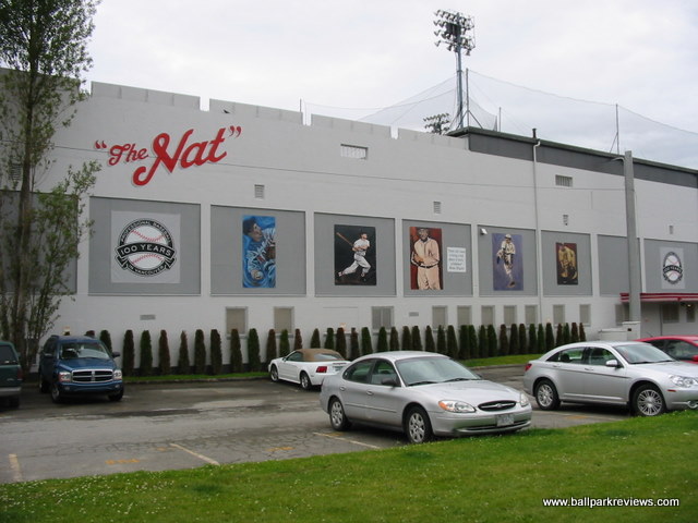 | There is just something different and refreshing about attending a minor league ballgame in Canada. As I noticed in Quebec City, the fans seem to be coming out to watch baseball and not all the other nonsense that goes on at most minor league parks. At Nat Bailey Stadium, this also holds true. Just like Quebec, Vancouver is blessed with a classic, no-frills ballpark that seems to suit the fans just fine. Located in a residential area, adjacent to Queen Elizabeth Park and south of downtown, the Nat's exterior is beautifully adorned with photos and quotes of famous ballplayers. Because of some construction on site, parking in 2007 is limited to on street, which could be a problem with large crowds. Fans enter into a brightly lit and immaculately clean concourse located underneath the grandstand. The concourse area is filled with small food kiosks, a souvenir store, and some displays of Vancouver baseball history. Concessions are a bit pricey (due to the Canadian dollar being so strong), but the quality is quite good. Along with normal ballpark fare, the Canadians offer Sushi, bratwursts, and burgers. As well, you can get a foot long hot dog which is one of the biggest (and best) I've ever had. Several portals lead from the concourse into the covered grandstand. Seating is split into two basic types - the box seats (green fold downs) and the general admission (wooden/metal benches with backs). Box seats will run you $15, which seems a but high for a short season A game, so you'll probably just want to buy the GA seats. The grandstand is quite large, so unless there is a big crowd, you'll get to sit wherever you want. A picnic area is located down the RF line and is open to the public when no groups have rented it out. In the left field area there is a small play area for kids, but since the fans here have come to watch the game, I didn't see it getting much use. As mentioned already, the atmosphere is not what you'll find at most minor league parks in the U.S. The team does do a couple between inning games and there is some music blared between innings, but there is no mascot and overall the emphasis is on baseball. And that's what the fans seem to want. Even on a cold June night, with the game running 3.5 hours long, most fans stayed until the game was over. The fans are here to watch a game and won't leave until it's over. For hardcore baseball fans, Nat Bailey is a real treat. Not only do you get a classic ballpark, but you also get a great atmosphere. It's nice to know that the American minor league experience has not seeped into Canada too much yet.