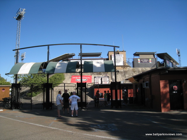 | Many ballparks claim to be cozy and intimate, but none may be more so than Visalia's Recreation Park. Not only does it have one of the smallest capacities in minor league baseball, but it also has a very small amount of foul territory. This combined with a unique design and new renovations make it a great place to experience a minor league ballgame. Located just off the downtown, parking is available in small lots and along the street. All parking is free - something that is becoming less and less common. The main entrance to the ballpark is now located in the right field corner, as the biggest part of the recent renovations were a new building along the third base side. These renovations included new team offices, a new grassy berm behind the right field fence, and new box seats. The park does have a bit of a choppy feel because it wasn't all built at the same time - for example the grandstand behind home plate does not directly connect to the new third base box seats. It makes the park a bit hard to navigate, but this is just a minor complaint. New fold down seats were also installed in the original grandstand, meaning that the whole park is void of bleachers. Down the first base line, there is a large covered beer garden (known as The Watering Hole) and additional picnic area. The beer garden offers misters which run occasionally to keep fans cool - something definitely needed in the hot California summers. Perhaps because of the intimate nature of the park, the team has felt it necessary to put up netting all the way down both lines, meaning there are no clean sightlines here. The grandstand behind home plate is quite steep, however, so this is probably the best place to sit. The concourse, located behind the main grandstand (out of view of the field) and above the third base seating (in view of the field), features just three concession stands offering a rather limited array of items. Burgers, hot dogs, and nachos are all available with various toppings. In addition, pulled pork sandwiches, Italian sausages, and chicken fingers are sold. The prices are reasonable, but it is a bit ridiculous that they offer no hot dog for less than $4.50. Come on - where is the kid's hot dog for a dollar or two ? After years of being known as the Oaks, the team changed names to the Rawhide in 2009. And you really have to give the team credit for carrying out the farm theme throughout the park - this can especially be seen with the barn built into the outfield wall and the team store (known as the "Rawhide General Store"). I also appreciate that there are several reminders throughout the park of past teams that have played here - this is always a nice touch. The atmosphere seems pretty laid back here as the focus is kept mostly on the game - there were a few between inning contests and there is a mascot (Tipper the cow), but nothing to distract you too much. The one problem I did have with the atmosphere may have been as a result of the Thirsty Thursday promotion. By the end of the game, there were numerous fans yelling obscenities. Honestly, I've never heard so much swearing at a sporting event as I heard here. With no ushers or security to stop them, it carried on for at least the last three innings of the game. Despite this, I really enjoyed my visit to Recreation Park. It is unique, charming, and cozy - just a great place to catch a game on a warm summer evening in California.