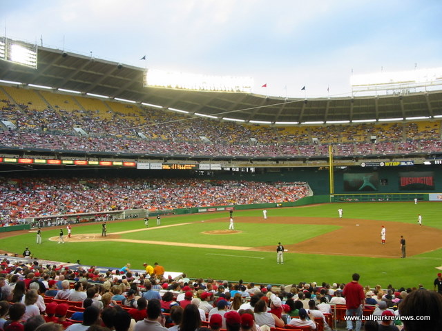 | Maybe I was expecting too much when I made my first visit to RFK Stadium in 2005. Or maybe it was just that I had forgotten that most of the circular, multi-use stadiums built in the 1960's and 1970's are not good venues to see baseball games. Or maybe I forgot that it was MLB who was still running the team and therefore just trying to make a buck. Whatever it was, I was less than impressed with the renovated RFK Stadium. Supposedly $18 million was spent to refurbish the stadium, but apparently all of it went to improving the player's comforts and none went to improving the fan experience. RFK Stadium is located on the east end of the city and is not easily accessible. Washington is a confusing city so finding the ballpark can be challenging. Large parking lots surround the stadium for which a reasonable $10 is charged. The exterior of the stadium is nothing to look at. Even the main entryway at the front of the stadium is not too inviting. Ticket booths and the team store are located in temporary trailers outside the park. Inside, the park most resembles Three Rivers Stadium or Busch Stadium. The concourses are dark and dingy besides being a bit narrow. A fair amount of temporary concession stands have been set up along the concourse, but unfortunately the variety leaves something to be desired. The only choices are italian sausages, foot long dogs, chicken tenders, and pizza. I couldn't even find a regular hot dog for sale. Concession prices were about average for a MLB stadium. The same could not be said for the souvenirs, though. A program costs $10 ! And no scorecards are sold. Fortunately one of the local newspapers hands out a free program/scorecard outside the park prior to the game. The seating at RFK is one of the positives. Even though most of the seats are old, they are quite wide and legroom is plentiful. Sightlines aren't great here, especially from the seats under the overhang of the mezzanine level. Also, foul territory is copious, so no seats are that close to the action. One of the unique features of RFK is the upper deck which varies in height - it rises up near first base and third base before dropping down behind home plate and in the outfield. A new video board was installed in the outfield, but I would have rather had them upgrade the sound system. The PA announcer was almost unintelligible and the music that was played you could hardly distinguish. Despite the negatives I encountered with the park, the fans still seem to be coming out and enjoying it. Most seem very much into the game and more cheering was heard than in some of the other new parks. RFK Stadium was only utilized as a temporary home for the Nationals until their new ballpark was built near the Anacosta River. That's a good thing since the days of these concrete cookie cutters have certainly passed. While in use, RFK certainly was near the bottom of my rankings.
