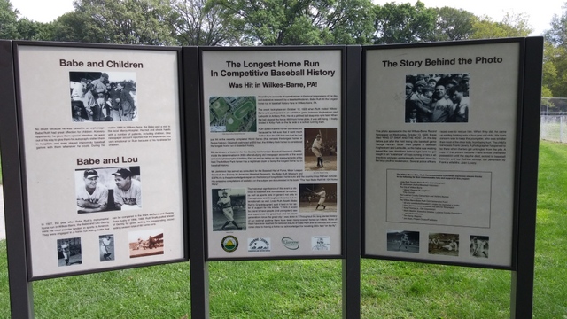 | Artillery Park was home to numerous Wilkes-Barre professional teams during the first half of the 20th century, mostly as part of the New York-Penn and Eastern Leagues. It is not clear when it was built, though it was definitely around in 1926 when Babe Ruth played an exhibition game here. Today, just a ball field exists on the site, though presumably there was a grandstand of some sort at one time. In 2012, a kiosk was constructed to commemorate a long home run that was hit by Babe Ruth here during his 1926 visit. The kiosk indicates that it is the longest known home run that Ruth ever hit - some 650 feet. It is located close to the place where the ball landed, which is between where a softball field and track not reside. Wilkes-Barre has not hosted professional baseball since 1955, though its name is on the current team which plays 15 miles north in Moosic.