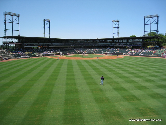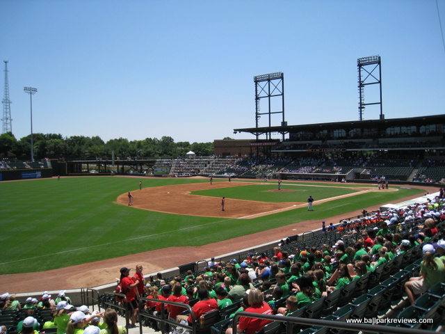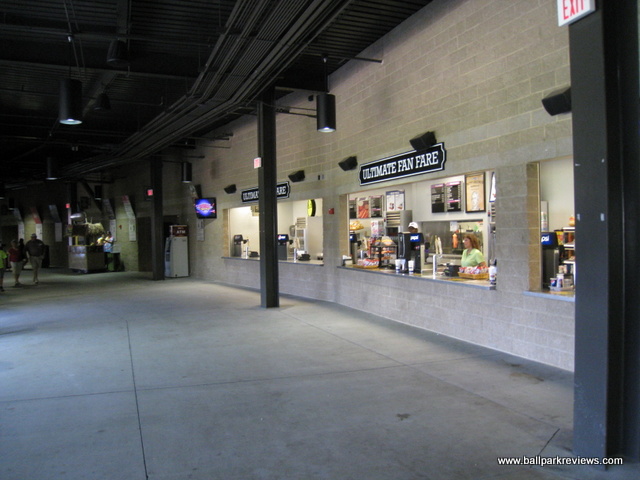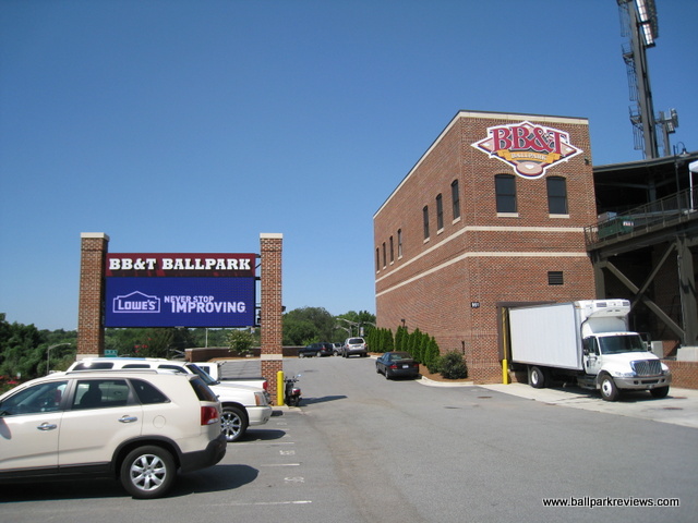 | After several years of financial haggling and construction delays, the city of Winston-Salem finally opened their new ballpark in 2010. Not that there was anything terribly wrong with their old home, Ernie Shore Field, but BB&T Ballpark is a clean, modern ballpark which allows the city to keep up with all the other North Carolina cities which have also built new minor league stadiums. BB&T Ballpark is located just to the south of the downtown and replaces a blighted neighborhood. Most of the fans park on the outfield side of the ballpark, so the team wisely decided to make the main entrance in center field. Parking seems limited for non-season ticket holders, but apparently there is enough as I haven’t heard any major complaints about this. One problem with the parking, though, is that because of how the ballpark is situated, they must climb a fairly steep hill after the game to get back to their cars. Even with the main entrance in the outfield, the façade of the ballpark is still attractive with its red brick. Inside, the ballpark is very spacious and the view of the city skyline provides a nice setting. Typical of most newer minor league ballparks, there is a full 360 degree concourse which allows fans plenty of places to roam around if they get bored. The concourse around the infield, which features several concession stands as well the pressbox, feels a bit tight in places, especially since the ceilings are not very high. Along the outfield concourse, there is a play area for kids (which features the same carousel that was at Ernie Shore Field) as well as a tiki bar for the adults. As of 2012, the park was still not 100% complete. The ticket offices as well as the team store were housed in temporary trailers near the main entrance in the outfield. Apparently a large building is supposed to be erected in right field at some point, which will feature permanent ticket offices and a larger team store. The Dash do a nice job of showing off the history of baseball in Winston-Salem as there are pictures and plaques along the concourse of famous alumni and significant baseball events in the city. Concessions here are only average at best, especially for a new ballpark. They offer several different types of hot dogs, a sub shop, and a few different varieties of fries (including garlic), but there was no BBQ to be found. Prices seemed high and the quality was lacking. They didn’t even have dipping sauce for the chicken tenders ! The atmosphere was also not to my liking, but part of that could have been due to the fact that I went to a weekday day game when the crowd was made up mostly of kids. The team has an on-field DJ (JJ) who came out every half inning to conduct some sort of contest. Fortunately they don’t go too overboard with their sound effects. There was also a mascot, Bolt, who was wondering around, though I’m not sure what he was supposed to be. BB&T Ballpark represents a new beginning for baseball in Winston-Salem and so far the fans have taken a liking to it. It certainly has everything that a modern ballpark needs, but for me, it was a bit unmemorable. Other than the view of the city skyline, there just isn’t much here that sets it apart from other new ballparks.