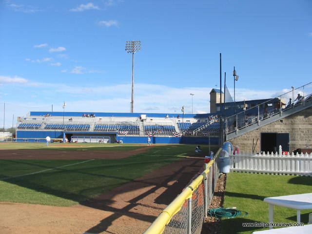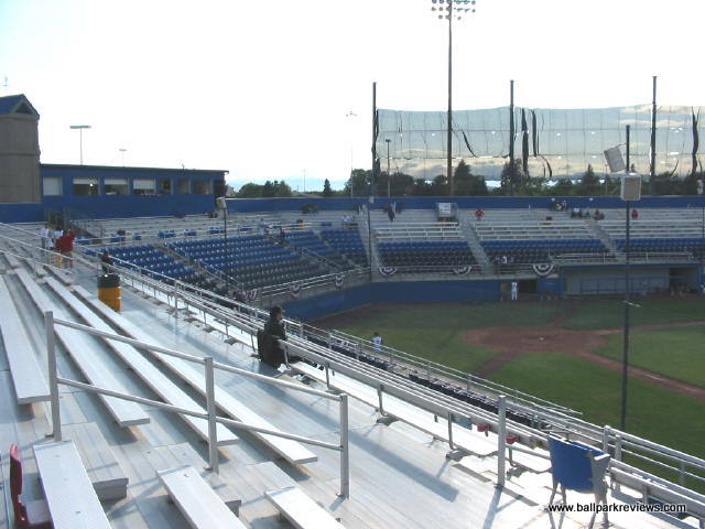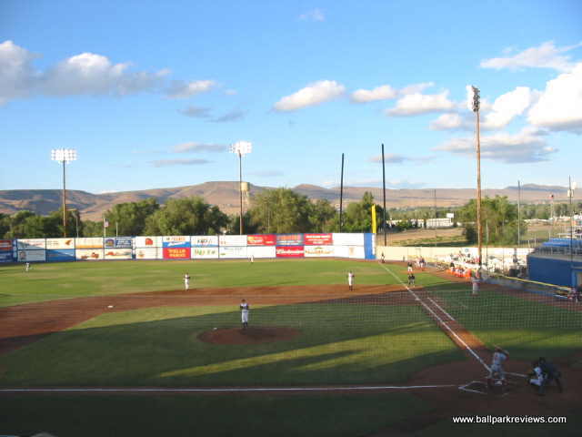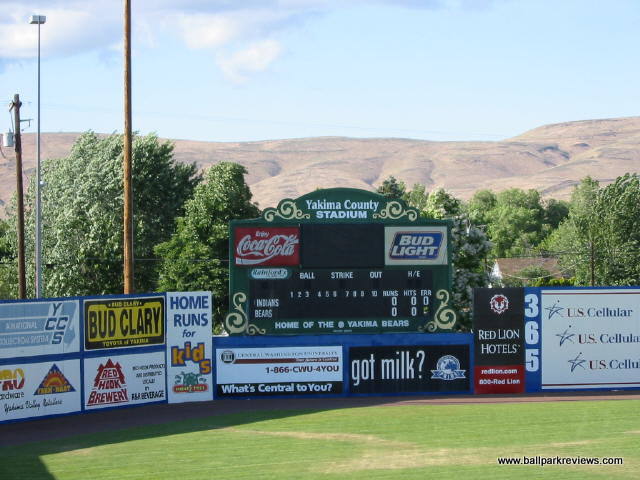 | Some ballparks can make up for a poor physical structure by having a great setting - Yakima County Stadium is one of these. Completely surrounded by rolling red (or brown) hills, the setting is quite spectacular. Unfortunately, the same can not be said about the park itself - it is cheaply built, has poor sightlines, and the seats are set high above the field. The biggest problem with the park is the backstop screen which runs from base to base, meaning there is not one clear sightline in any section of seating. Also, the seats are 10 feet above the field, presumably because the clubhouses are built beneath them. Another peculiar feature is the large black net erected behind the third base grandstand - I'm not sure what its purpose is, but it looks hideous. Fortunately, the atmosphere is pretty good here - the team does some of the typical between inning contests, but most fans seemed to be into the game and many stayed until the end even on a very cool evening. Yakima has a mascot named Boomer (how many Boomers are there ?) who stayed busy annoying fans most of the game. Concession stands are located behind the grandstand. They offer the ballpark basics as well as some made to order grill items (burgers, sausages, dogs, etc.) A small team store is also located off the concourse. One of the nicer features of the ballpark is the hand operated scoreboard in left field, which adds some charm to an otherwise boring park. In a different setting, Yakima County Stadium would probably rank lower in my book, but the great setting and ballpark atmosphere make for an enjoyable visit. Unfortunately, 2012 was the last season for the Bears in Yakima as they moved to a new ballpark in Hillsboro (OR) for the '13 season. For a panoramic of the field, click here.