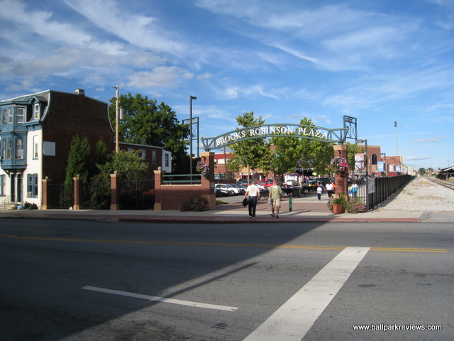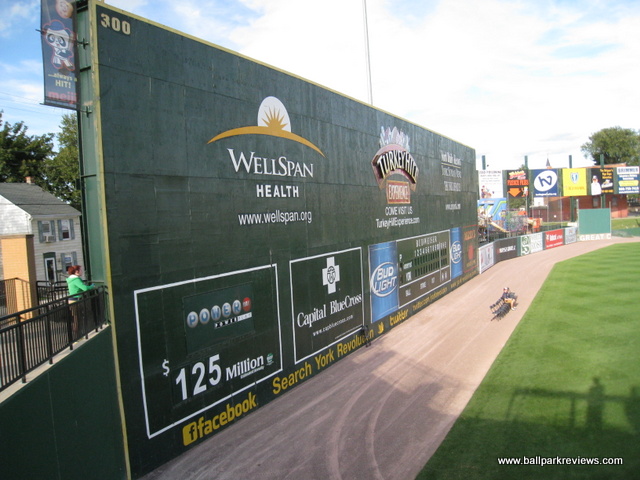 | After many years of discussion, a new ballpark finally opened in York in 2007. However, it was a month late in opening and parts of it remained unfinished throughout the inaugural season. Located just north of the downtown, the ballpark was squeezed into a city block so has a rather small footprint. Parking can be found in various small lots, both north and south of the ballpark, for $3 - $5. The exterior of the stadium is done in the familiar red brick and features a large plaza named after Brooks Robinson. Inside, the structure of the ballpark is very similar to all the rest of the Atlantic League ballparks, especially that of Lancaster's Clipper Magazine Stadium which almost feels like an identical twin. The most unique aspect of the ballpark is the "Green Monster" lookalike in left field, known as the "Arch Nemesis" (because it is adjacent to Arch Street). I don't mind them putting up a big wall, but couldn't they be a bit more original ? Why does it have to be green and have a manual scoreboard just like the one at Fenway ? Next to the "Arch Nemesis" is a huge play area for the kids, complete with a carousel. The concourse around the infield is a bit narrow, which is especially annoying on nights when there are large crowds. Seating is all fold down chairs, but the sightlines are rather poor for a new ballpark. For some reason, the architect decided to angle the seats down the lines towards the infield. This causes one of the outfield corners to be obscured for almost all fans. There is also a large picnic area in the RF corner and a berm (no grass yet) behind the right field fence. A small team store is located behind home plate, but seemed to be a bit messy. Concession choices include Italian sausages, pizza, burgers, and funnel cakes besides the normal ballpark fare. Prices and quality were about average. Just one complaint about the concessions - there doesn't seem to be enough stands as lines tend to be very long on nights when here are large crowds. As with many newer ballparks, the atmosphere is a bit over the top. There was constant sound effects while the home team was batting, which was very annoying. Some between inning games were done, but they were all the ordinary ones you'd expect to see. The team does have a mascot, but he wasn't seen much. The most amusing thing for me was watching the fans do the wave in the bottom of 9th inning while the Revolution were in the middle of the rally ! Could the fans have been that bored ? Just odd. While PeoplesBank Park is a fine ballpark, the overall atmosphere is a bit too crazy for my liking and it just feels too much like a copycat of the nearby Lancaster ballpark. Still, it fits in well with the rest of the Atlantic League ballparks.