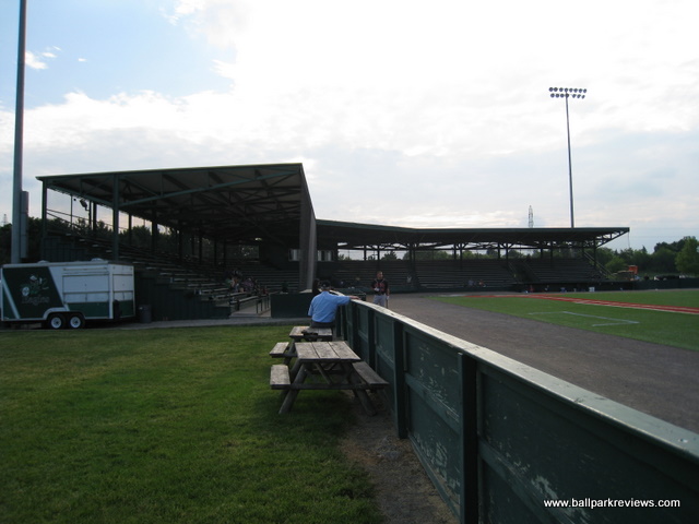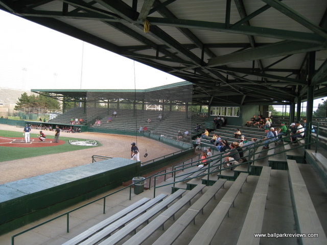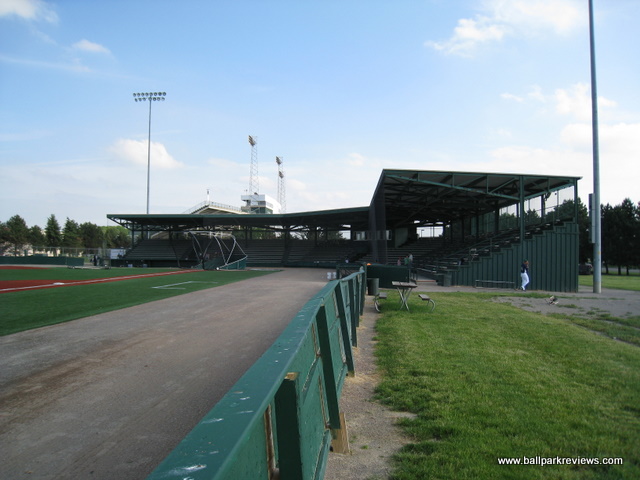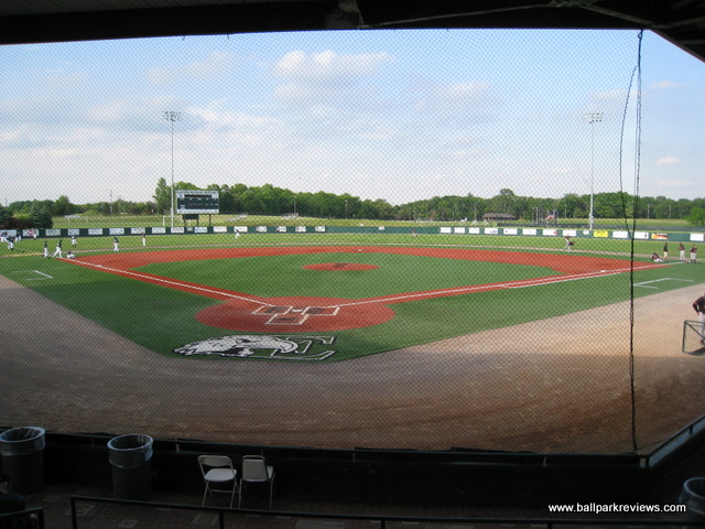 | Oestrike Stadium got its first shot at hosting professional baseball in 2009 when the Midwest Sliders (previously a traveling team in the Frontier League) moved here. Certainly this is just a one year move as the Sliders are awaiting their new home to be built in Oakland County where they will be rebranded the Oakland County Cruisers. But after attending a game here, I was left to wonder what the point was in even finding a temporary home for the Sliders. It appeared that little effort was being made to market the team and practically nobody was showing up at the games. Oestrike Stadium is located on the campus of Eastern Michigan University, right next to the football stadium. The park features a cozy little grandstand that is completely covered. All the seating is metal benches (without backs), so is certainly not the most comfortable place to watch a game. There is also a grassy berm that surrounds the park, though I don't think fans are really encouraged to use it. The field here is comprised of a Field Turf infield and grass outfield. The two areas are split by a dirt path, which almost seems to be a warning track of some sort. A simple scoreboard is located behind the fence in left field. The press box behind home plate is also a bit small as there is no room for the radio announcers. They are forced to sit at a table in front of the press box, so all the fans can hear them during the game. The concourse at Oestrike Stadium is located behind the grandstand. Concessions are sold out of a temporary trailer. No alcohol is sold and just basic food options are available - hot dogs, brats, and chicken sandwiches. Despite the very small crowd (probably less than 100) there the night I attended a game here, the atmosphere was not too depressing. Walk-up music was played for each batter, though the sound system was a bit too loud at times. There was also a few between inning contests such as the dizzy bat race and Let's Make a Deal. Strangely the team has no mascot. If you want to see a professional ballgame at Oestrike Stadium, I'm pretty sure 2009 will be your only chance. But only go if you're a hardcore baseball fan, as there is little else to distract fans here.