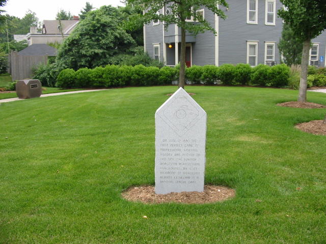 This monument celebrates the site of the first perfect game pitched in National League history. It is located on the campus of Becker College.