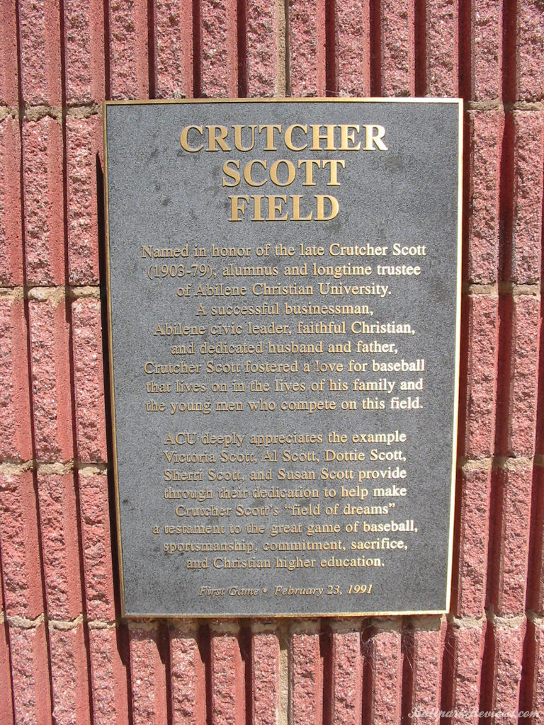 | Crutcher Scott Field was home to the Abilene Prairie Dogs of the Texas-Louisiana League for several years in the mid 1990's. It is located on the campus of Abilene Christian University and is a fairly typical collegiate ballpark. It is made up of entirely metal seating, some of which is fold down chairs, but most of which is benches. One oddity about Scott Field is the lack of dirt baselines along first base and third base, something which I've seen at other parks in Pensacola and Mobile. While this park would still be suitable for independent baseball, I have not heard anything recently about Abilene trying to lure a team back. A plaque commemorates the legacy of Crutcher Scott, whom the ballpark is named after.