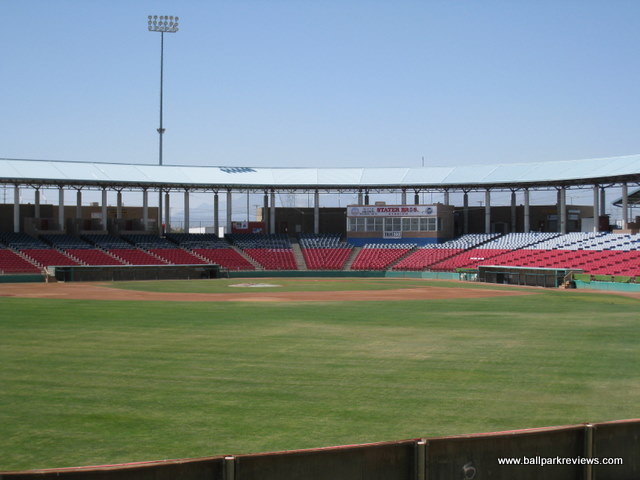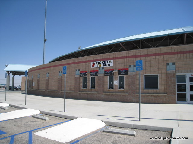| Stater Bros. Stadium has been called by some an "oasis" in the middle of the desert. And I think that's a pretty accurate description. Depending on the route you take in, you may see some of the most desolate land in the country. It is pretty remarkable that baseball has survived in the middle of the desert. I was unable to get inside Stater Bros. Stadium on my visit here in 2008, but it looks to be a fairly standard 1990's ballpark. There have been rumors floating that the Mavericks could be one of two California League teams (the other being Bakersfield) shifted to the Carolina League for the 2010 season. While it didn't happen in 2010, it finally will happen in 2017. After disputes between the team and the city, it was only a matter of time. After the Cal League team left, the Pecos League put a team here starting in 2017. That team went defunct before the 2021 season.
