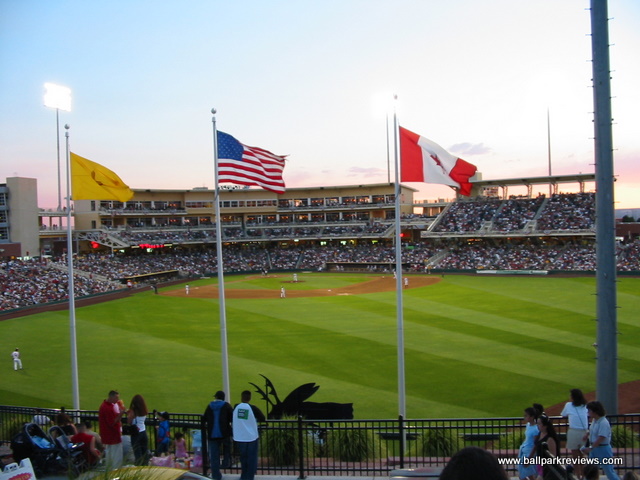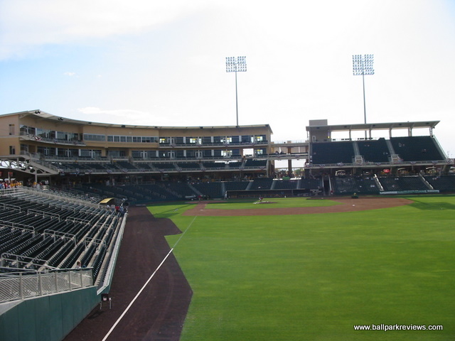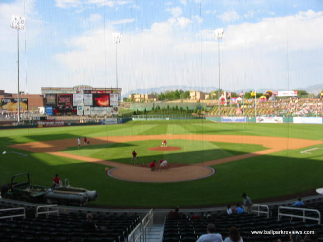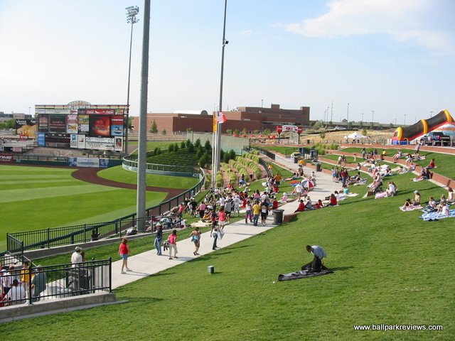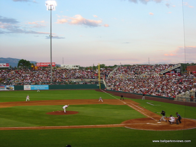 | After the Albuquerque Dukes moved to Portland in 2001, it was obvious that a new ballpark would need to be built in order to attract a new team. So the city decided to essentially scrap Albuquerque Sports Stadium and start over. While Isotopes Park is on the same parcel of land, it is a brand new park. The exterior has a very southwestern feel to it as the light brown color gives the appearance of adobe. Combined with the player silhouettes which adorn the first base and third base entry ways and colored panels which light up at night, the park has a very distinct appearance. Inside, the park follows the template of most other new AAA parks. A wide concourse wraps all the around the park and is in view of the field. Seating is made up of all fold down green seats and is broken into three levels : lower box, club level, and upper deck (on the third base side). Most sightlines are excellent as the seats in the outfield are slanted towards the infield. A large grassy berm in right field as well as a huge picnic area in left field provide additional seating. While the structure of the ballpark is nice, it is the setting and atmosphere that make this a great place to see a game. Beyond the outfield fence there is a great view of the mountains. The atmosphere is laid back with only a few between inning contests and no sound effects. I could do without the ushers being so restrictive, but in fairness they may have only been that way since it was a sellout the night I attended a game. Concessions are on par with some major league teams, both in variety and price. Everything from Mexican to subs to burgers to salads are available at the numerous concession stands which dot the concourse. And the quality of concessions is above average. A large gift store behind home plate offers a plethora of Isotopes merchandise which has become a hot seller. Due to the high altitude, the field dimensions are larger than at most parks. This allowed the designers to add a small incline near the center field fence, which is a unique touch. Unfortunately, the most unique aspect of the old ballpark (the drive-in) was scrapped from the design of Isotopes Park due to security concerns. Parking is available in nearby lots at no cost. Perhaps losing the Dukes was a blessing in disguise. Doing so forced the city to build a new park which is now one of the superior facilities at the AAA level. Just a fun and pleasant place to see a game.