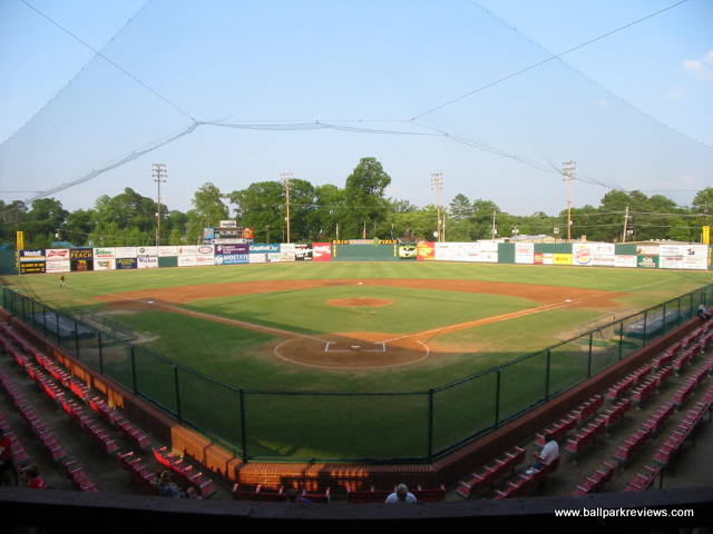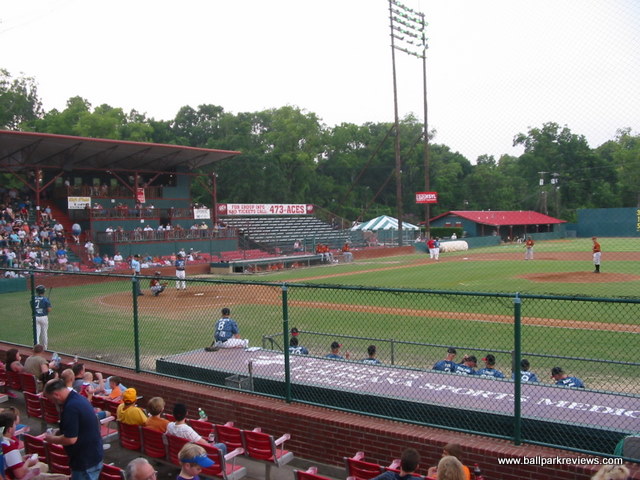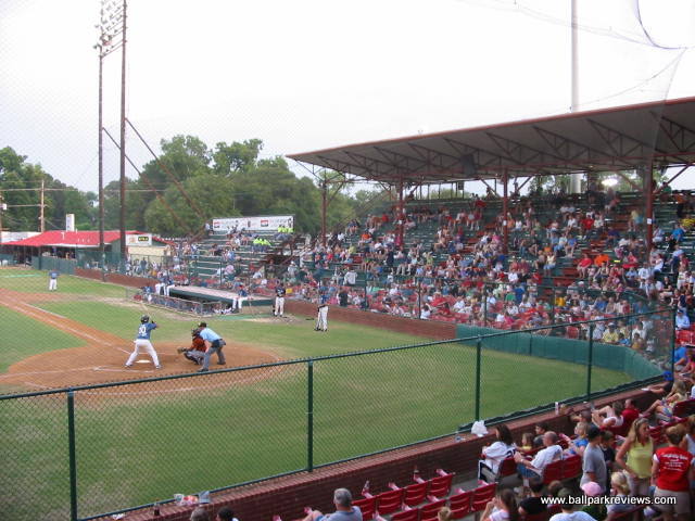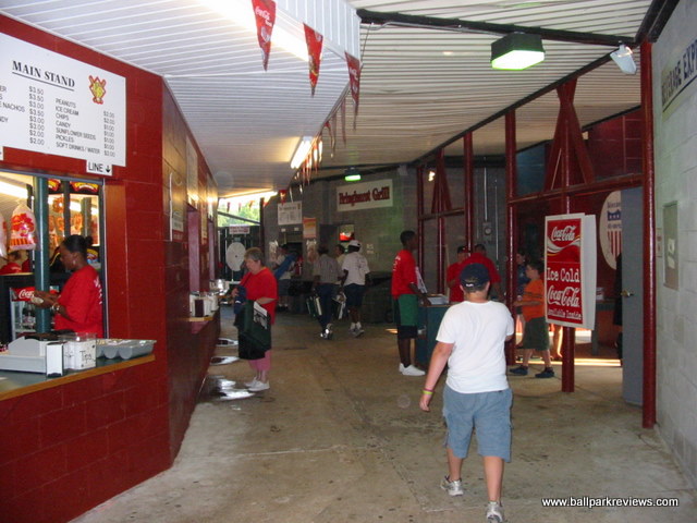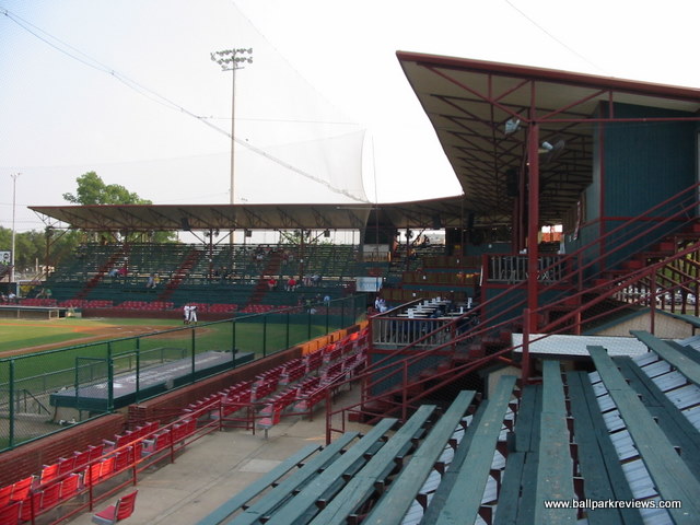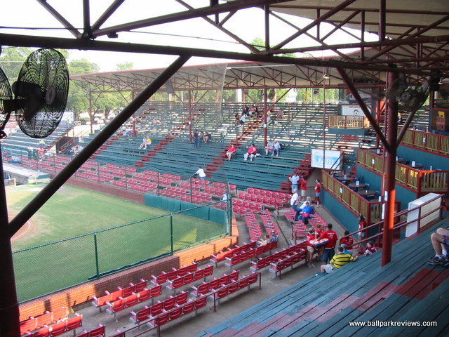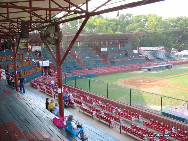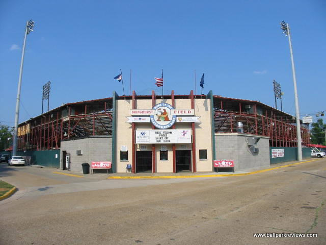 | Bringhurst Field certainly harkens back to a different era of minor league baseball, so I was happy to learn that pro baseball was returning here in 2006 after a one year hiatus, as this afforded me an opportunity to see a game here. Located on the outskirts of town (next to the city zoo), Bringhurst Field has been home to teams in numerous leagues since its opening in 1934, but the teams have almost always been knows as the Aces. The ballpark consists of a large wooden grandstand where most fans seem content to bring in lawn chairs or else just sit on the flooring (there are no benches). One neat aspect of the grandstand is the electric fans that have been installed on each of the posts in order to keep the fans cool in the hot Louisiana summer. In addition to the grandstand seating, there are four rows of box seats, a bleacher section down each line, and two corporate party decks (the closest thing they have to luxury boxes). The concourse, which is quite narrow (reminiscent of Veterans Memorial Stadium I in Cedar Rapids), is located underneath the grandstand. It features several concession stands and a small souvenir store. Concessions are rather basic with the only unique items being boudin and polish sausages. Prices on everything at Bringhurst are very affordable : tickets are just $3, programs are just $1, parking is free. The atmosphere definitely has a small town or community feel to it. While a few between inning games were done and the team does have a mascot (Alex the Ace), the focus seems to be mostly on baseball. And it seems as if that's what the fans want as I witnessed some of the most vocal (although obnoxious) fans I've ever come across. The only complaint I have with Bringhurst Field is the large chain link fence and netting with protects the entire grandstand. This obscures the sightlines quite a bit, especially in the box seats. I just don't understand the need for such a large net. Overall, though, I really enjoyed my visit to Bringhurst - it's an old time ballpark with a good baseball atmosphere, something that can't be found much anymore. Unfortunately, it doesn't appear that baseball will be played here in the near future. A fire destroyed the clubhouse building in 2014 and shortly thereafter the grandstand was deemed unsafe. In 2017, the outfield fence and scoreboard were removed and the playing field was turned into a "green space" for community use. While the grandstand is still standing, its future has not yet been decided.