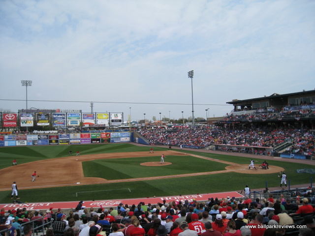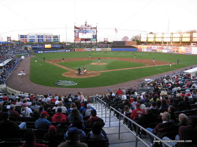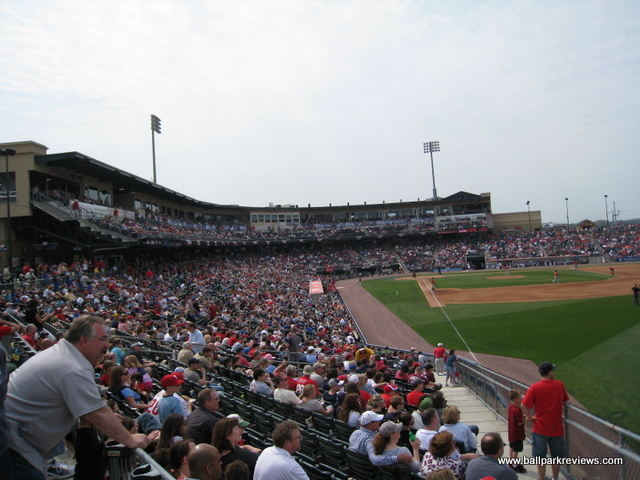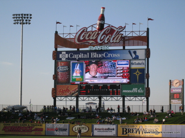 | The opening of Coca-Cola Park in 2008 allowed for professional baseball to return to Allentown for the first time since 2003 when the Ambassadors of the Northern League played at Bicentennial Field, a venue that was substandard even by independent league measures. So when the Iron Pigs arrived, it was probably a sure bet that most fans had never heard of the Ambassadors or had long since forgotten about them. Coca-Cola Park is a nice enough new venue, resembling many other new ballparks built in the past decade. It is on the small side for a AAA park, which does make it more intimate. Located off of Airport Rd (and thus closeby to the Lehigh Valley Airport), the setting is boring as there is no view to speak of from any seat in the ballpark. A wraparound concourse allows fans to circle the field and take in the game from numerous angles. A nice touch is the copious amounts of counter space that was built for folks who like to stand. This feature is very reminiscent of what you'll find at Citizens Bank Park in nearby Philadelphia. All seats are angled toward home plate which allow fans a good view of the action, except when balls are hit into the outfield corners. As can be expected, there are numerous luxury boxes, most of which are stacked above the concourse. But there are also a couple located on the field level right behind home plate. While these are unique at the minor league level, they do take away some good seats. A large, multi-tiered picnic area is located along the left field line. Behind the left field fence, there is a grassy berm where the overflow crowd can sit. Also, as with every new park, there is a play area for the kids - this one located behind the picnic area in left field. Concessions at Coca-Cola Park are well varied and very reasonably priced. Some of the food options include burgers, Italian sausages, meatball sandwiches, Philly cheese steaks, BBQ sandwiches, walking tacos, gyros, and corn on the cob. A large, well stocked team store is located in the right field corner, right next to the main entrance to the ballpark. The atmosphere is a bit busier than other AAA parks as the team did several between inning contests. But overall, it was pretty relaxing. Just two minor complaints - first, why they feel the need to create two huge walls of ads in the outfield ? Not only are they ugly, but they serve no useful purpose. Fortunately they are not blocking the view of anything. Secondly, because of where the parking lots are located, almost every fan must cross the road to get to their cars. This causes quite a problem after the game, especially if you don't get to your car right away. Otherwise, I really enjoyed my visit. The IronPigs really seemed to have followed the model set by the Reading Phillies and this have had no problems filling up the park for five years running now. There is nothing too memorable about Coca-Cola Park, but when the fans in Allentown had nothing before, this is surely a place to be proud of.