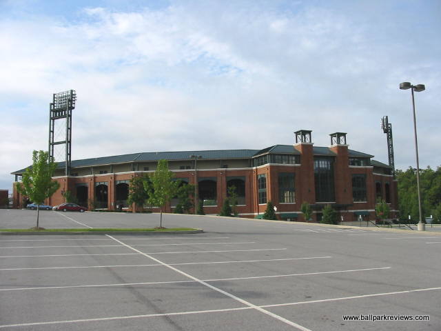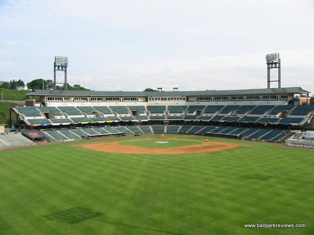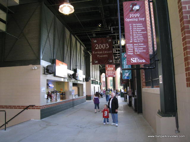 | Blair County Ballpark is a new double-A park that actually doesn't follow the usual template of most new facilities built since the early 90's. While the park is unique in this sense, I don't like it as much as many of the other new parks. The park does have an interesting location as an amusement park is adjacent to the ballpark. This allows for a roller coaster to provide the back drop in right field. And if you are there on a night when the park is open, you'll see the roller coaster with "Go Curve" spelled out on the side. Fans enter the park on the upper concourse which runs behind the seating areas, out of view of the field. This upper concourse allows access to the upper deck seating, where the majority of the seats are located. The lower concourse runs underneath the upper deck and is in view of the field. It features numerous concessions stands offering sausages, pizza, buffalo chicken tenders, bbq sandwiches, and cinnamon roasted nuts as well as the standard ballpark fare. There is a large BBQ stand along the first base line, but strangely they only server burgers there. Prices are average for the minor league level while quality is a little above average. While the seating is very comfortable due to the spaciousness of the seats, it is a bit far from the field for such a new park, especially that in the upper deck. Over recent years bleachers have been added in left field along with some bar-type seating. There is also a large picnic area located down the 3rd base line. One aspect I don't like about BCB is all the picnic tables located along the lower concourse. This makes that area feel much more cramped than it needs to. When you have a large picnic area already, I'm not sure why you need to flood the concourse with tables as well. Along the first base concourse are games for the kids like what you'd find at an amusement park, which are actually kinda neat. A small gift store is located off of the upper concourse. Parking is $2 in the garage behind the outfield wall. Overall, Blair County Ballpark is a very pleasant place to see a game. And it's obvious that folks in Altoona think the same, as they continue to fill the ballpark year after year.