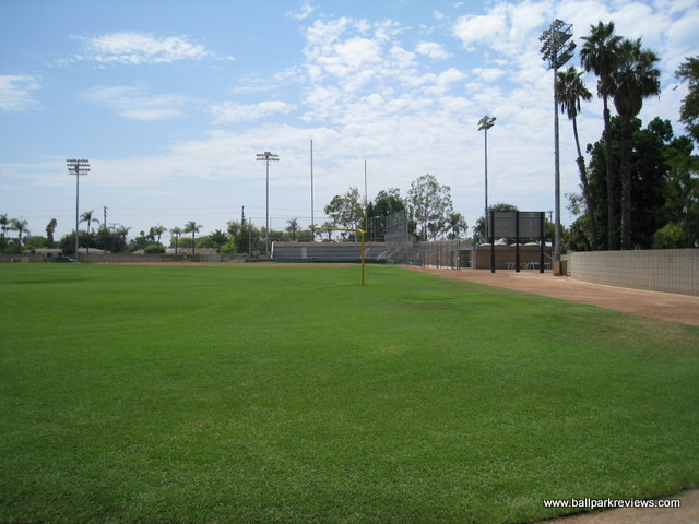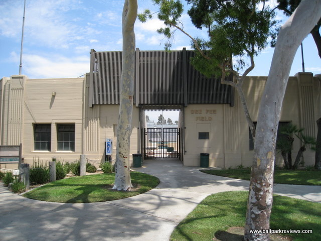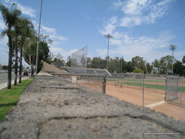 | Though it's been around since 1939, La Palma Park was only used for professional baseball for three seasons - all back in the 1940's. Currently it doubles as a football stadium as a large grandstand is located behind the outfield fence. La Palma Park was also the sight where some scenes from the Jackie Robinson Story were filmed in 1950. I was unable to get inside on my visit here in 2008. |
