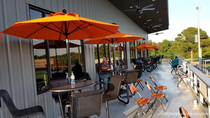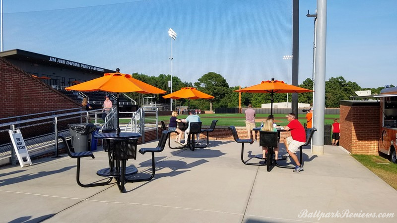 - Patio-style tables and chairs (with umbrellas) are setup both on the first base side at field level and on top of the third base grandstand. These are available for anyone to sit in.