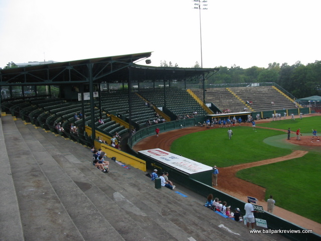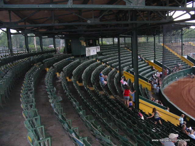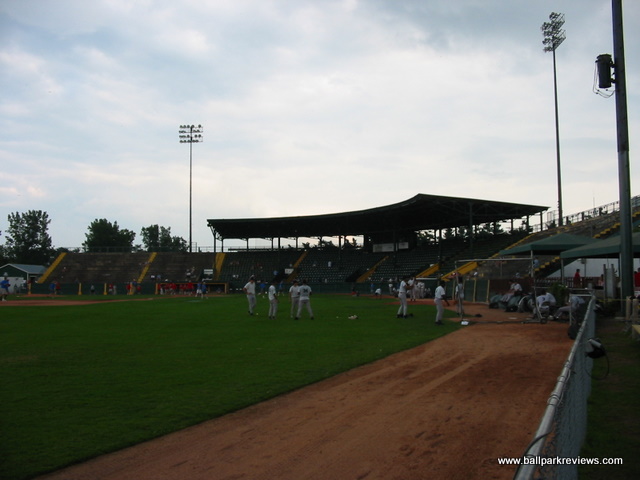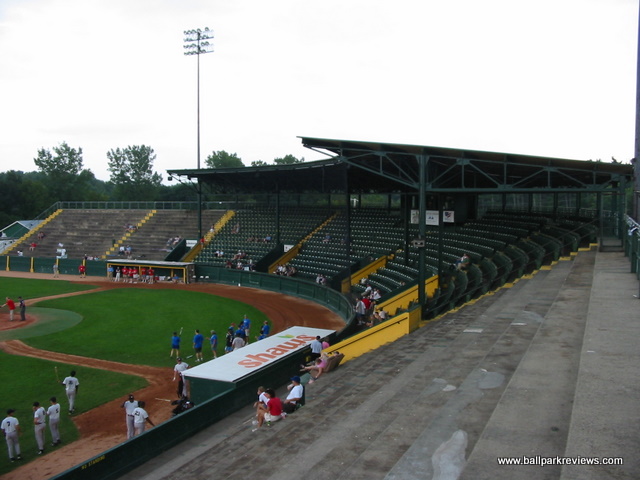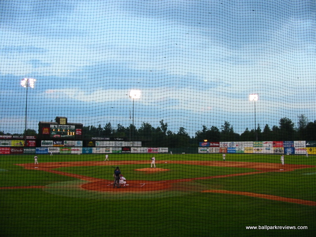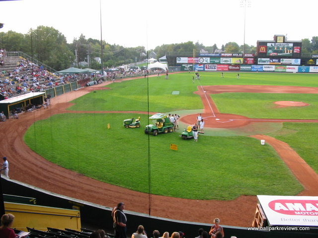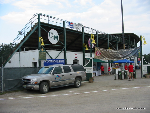 | Centennial Field is home of the Vermont Lake Monsters (a new name as of 2006) of the New York-Penn League. It is one of the oldest parks still in use in the minors, but is still in excellent shape. The covered grandstand behind home plate is a classic. My only complaints are that it sits a little far from home plate and the old wooden seats are a bit cramped. The grandstand is made up solely of individual seats as of 2013 when renovations were done, finally alleviating the park of the uncomfortable concrete seating that existed for years. A picnic area is located down the left field line, while the concourse area behind the third base side houses the concession stands. The atmosphere here centers around their mascot Champ, who is known to delay the game at times as he did one night when I was there. Though maybe not as bad as Hudson Valley, there promotions seem to go overboard at times. Certainly one of my favorite parks in the NY-Penn League. Unfortunately, with the minor league restructuring of 2021, the Lake Monsters were left out and were unable to find a new pro league to play in.