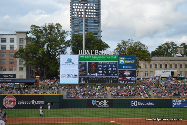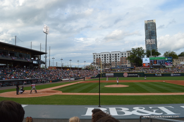 Despite the glowing reviews I had heard about BB&T Ballpark (including Baseball America naming it the "Best Ballpark" in the minors), I was skeptical about how much I would like it. But I came away impressed. The downtown location gives it a sense of place, the seating options are plentiful, and the concessions are excellent. Other than the excessive netting above the dugouts, there is little not to like about BB&T Ballpark. It is probably in my top 5 of all the AAA ballparks I've seen.
