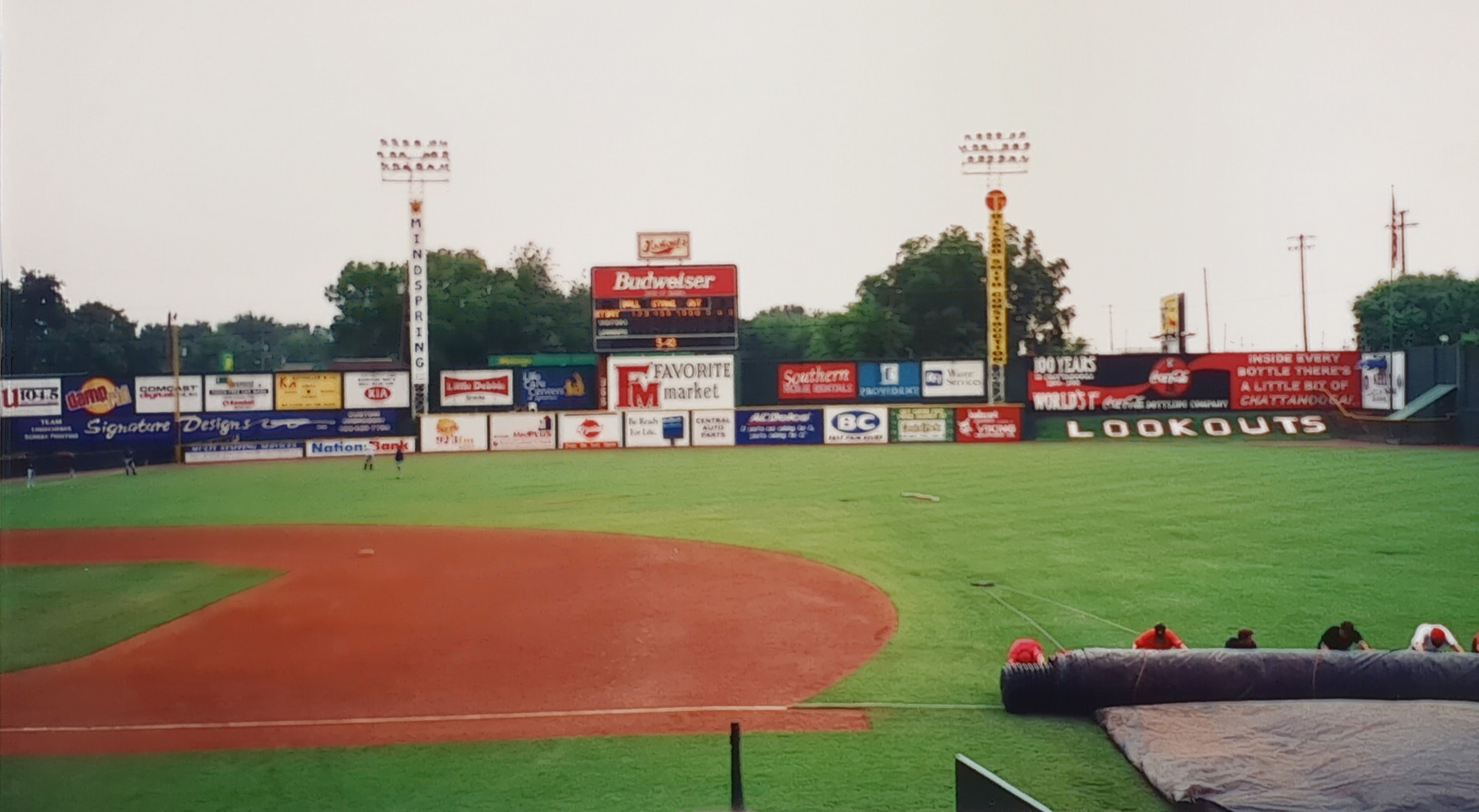 in centerfield that has the word "Lookouts" written on it. It is over