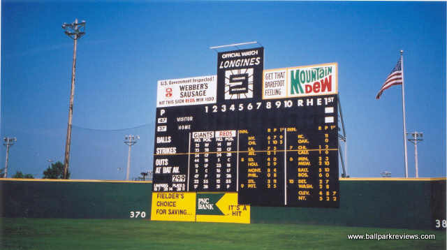 the outfield fence and scoreboard looking as they did at Crosley. This